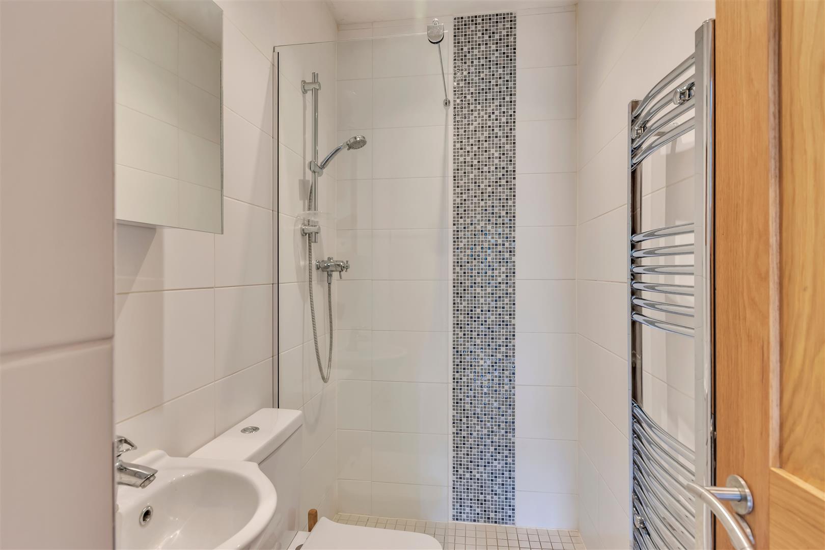 Wet room style floor with mains shower, side screen, w.c, wash hand basin, heated towel rail, fully tiled walls and extractor.