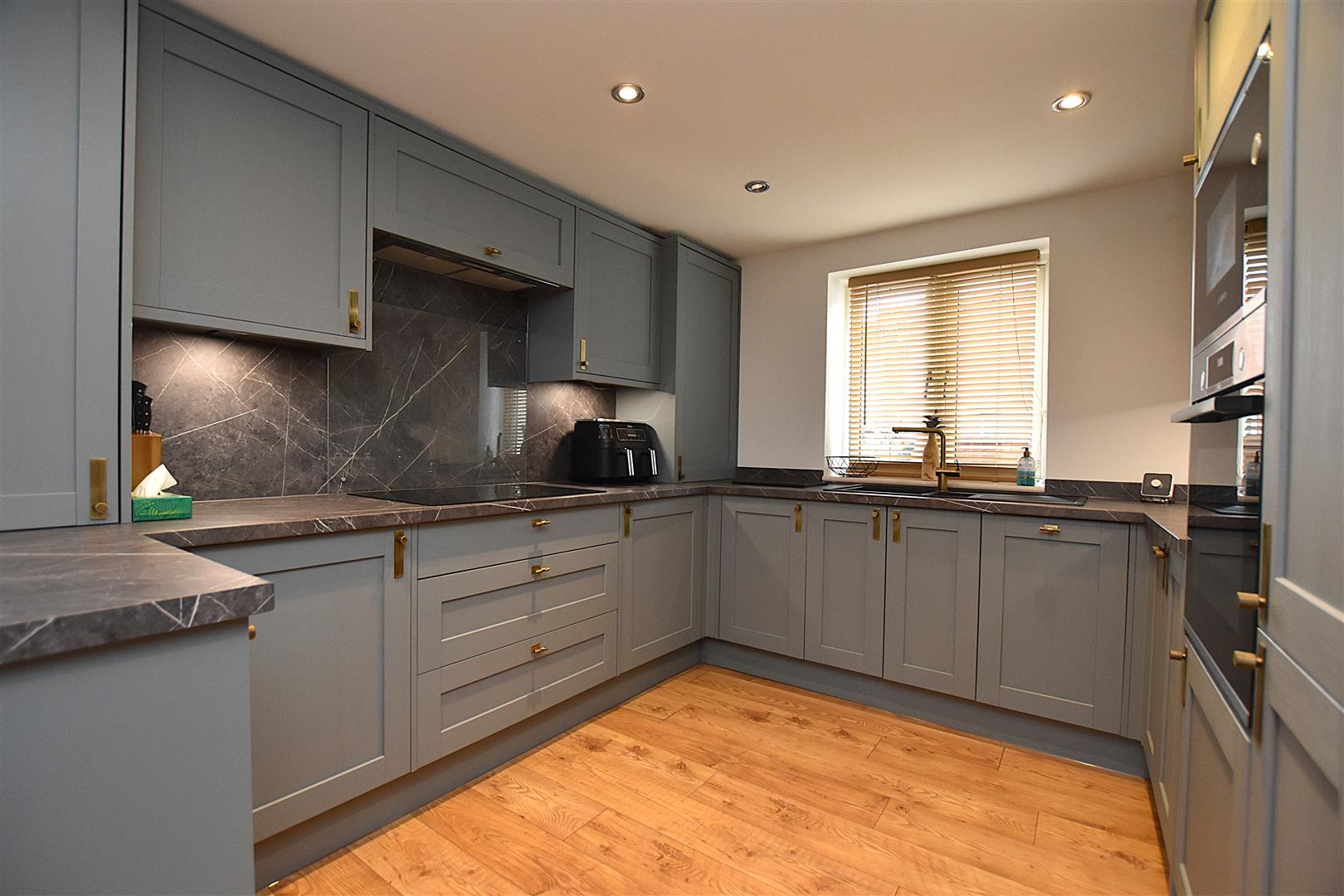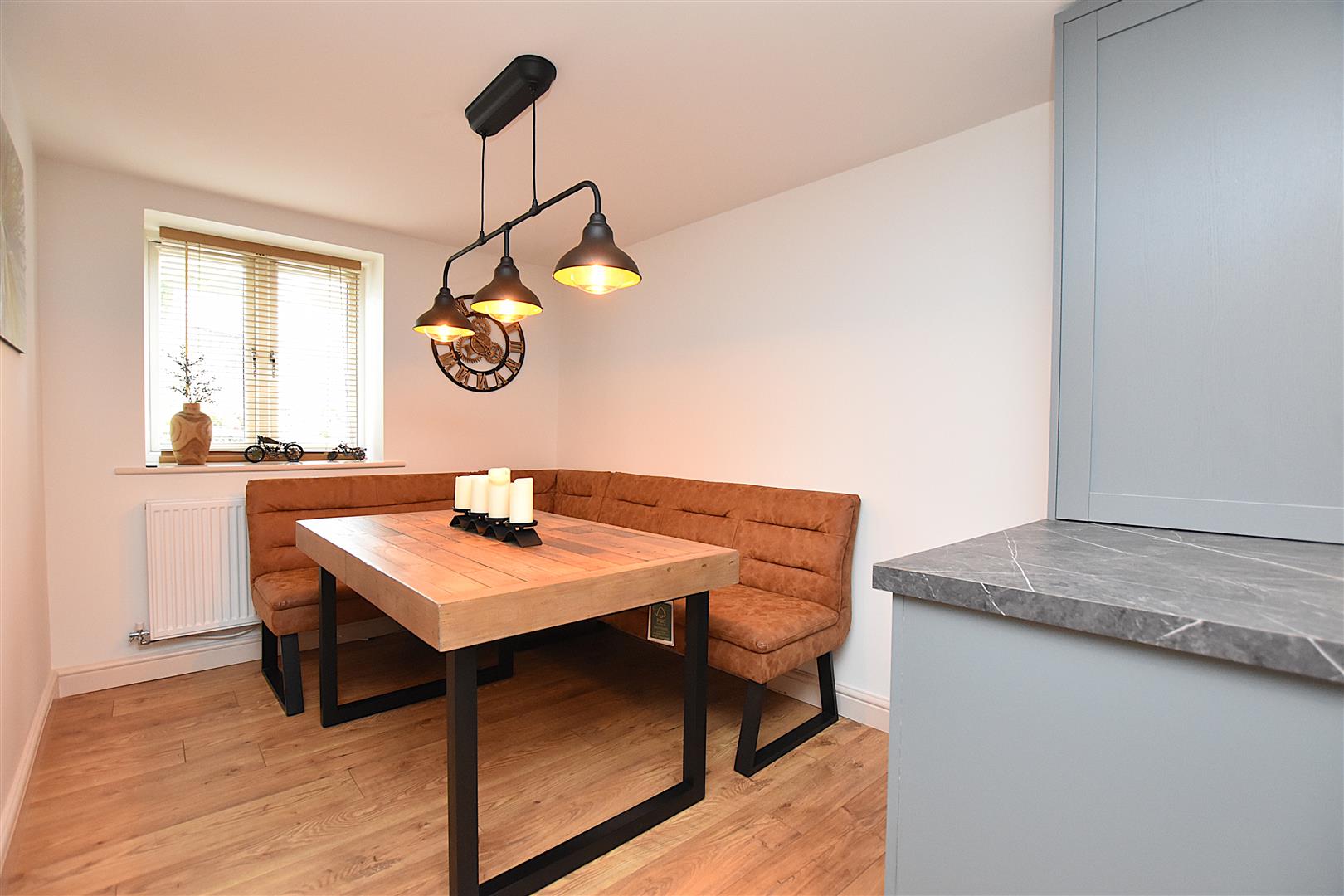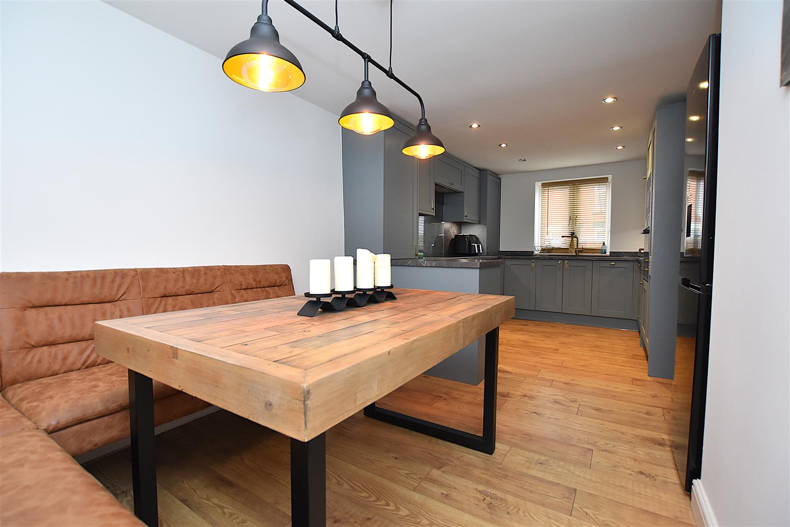 An impressive spacious and sociable room with the kitchen area recently appointed with a stylish range of shaker style base and wall units complimented by work surface areas and matching upstands, incorporating a 5 ring electric hob with extractor above and wide cutlery and pan drawers below, Bosch integrated oven/ grill, Bosch integrated microwave oven, integrated washing machine and dishwasher, 1 1/2 bowl sink unit with mixer tap and Upvc double glazed window above, inset ceiling spotlights, concealed gas combination boiler and wood effect flooring that continues into the dining area with Upvc double glazed window to rear and radiator.