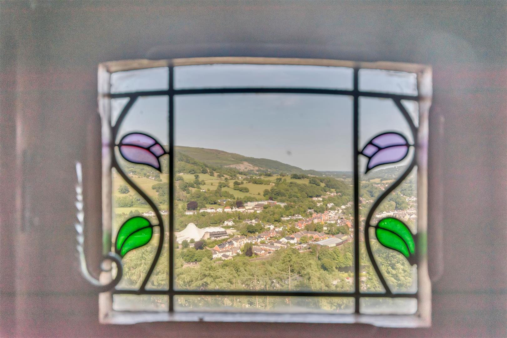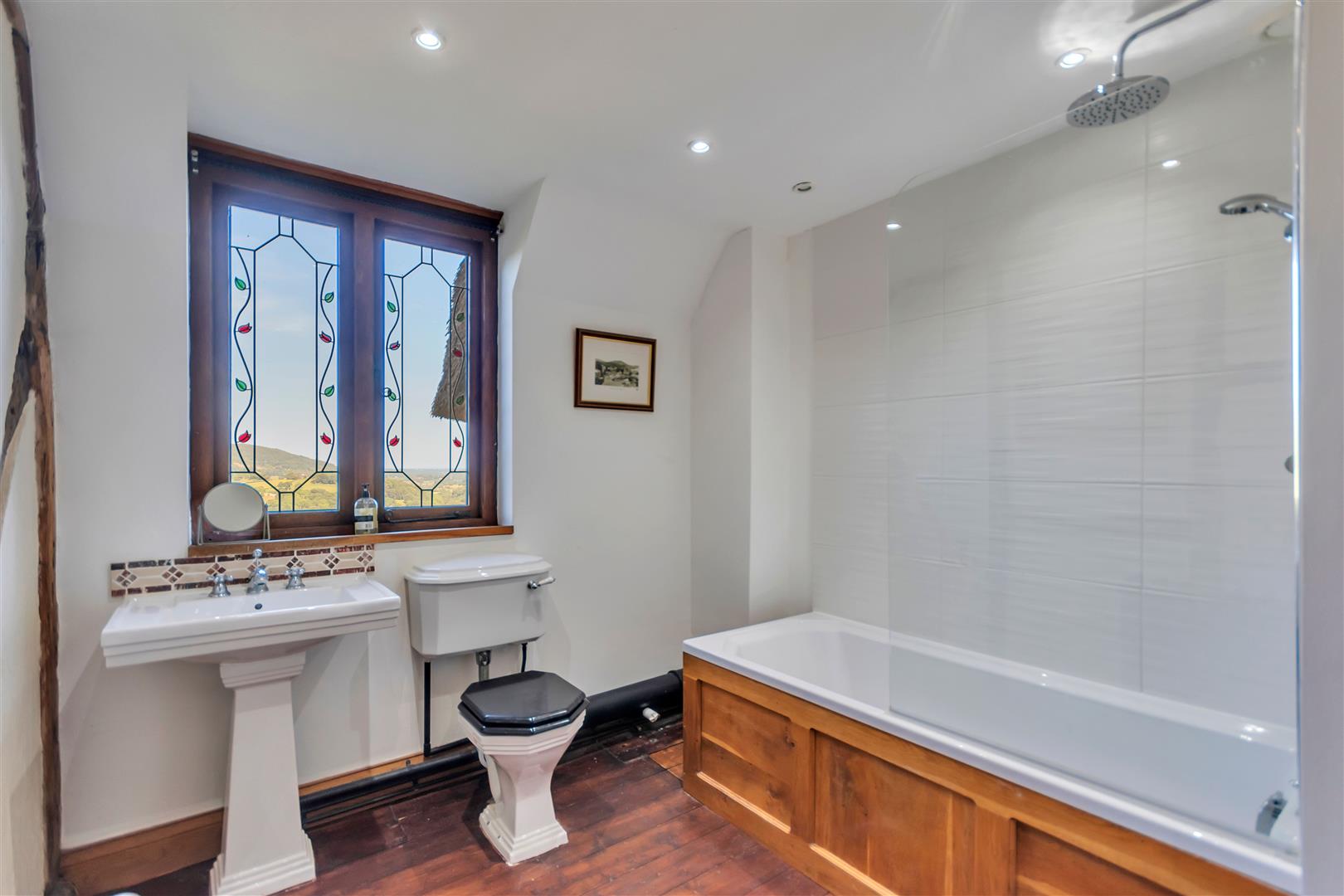 Bath with mains shower over and side screen, pedestal wash hand basin, low level WC, exposed timber flooring, recessed ceiling spotlights and stained glass window to the front with panoramic views.