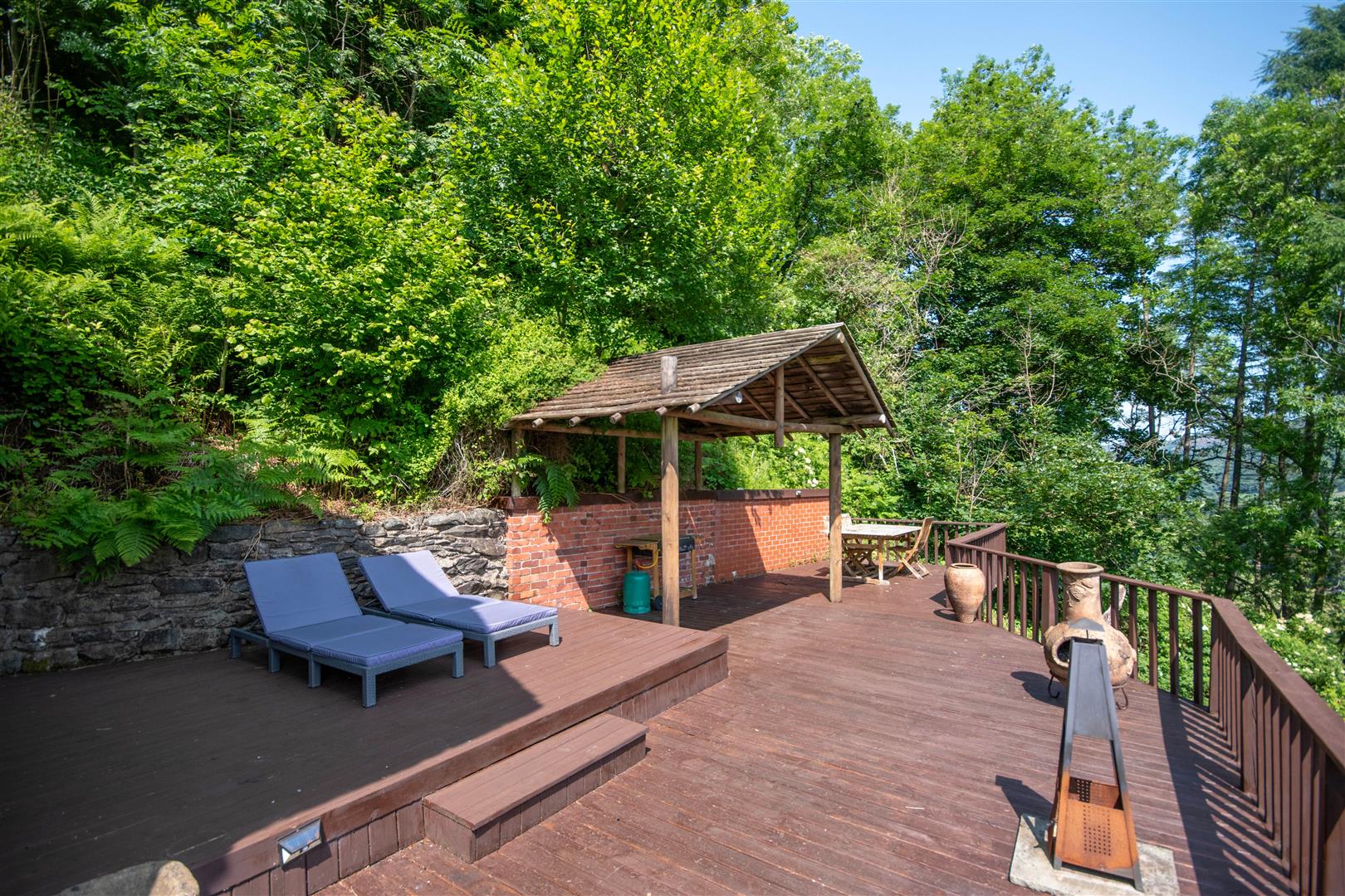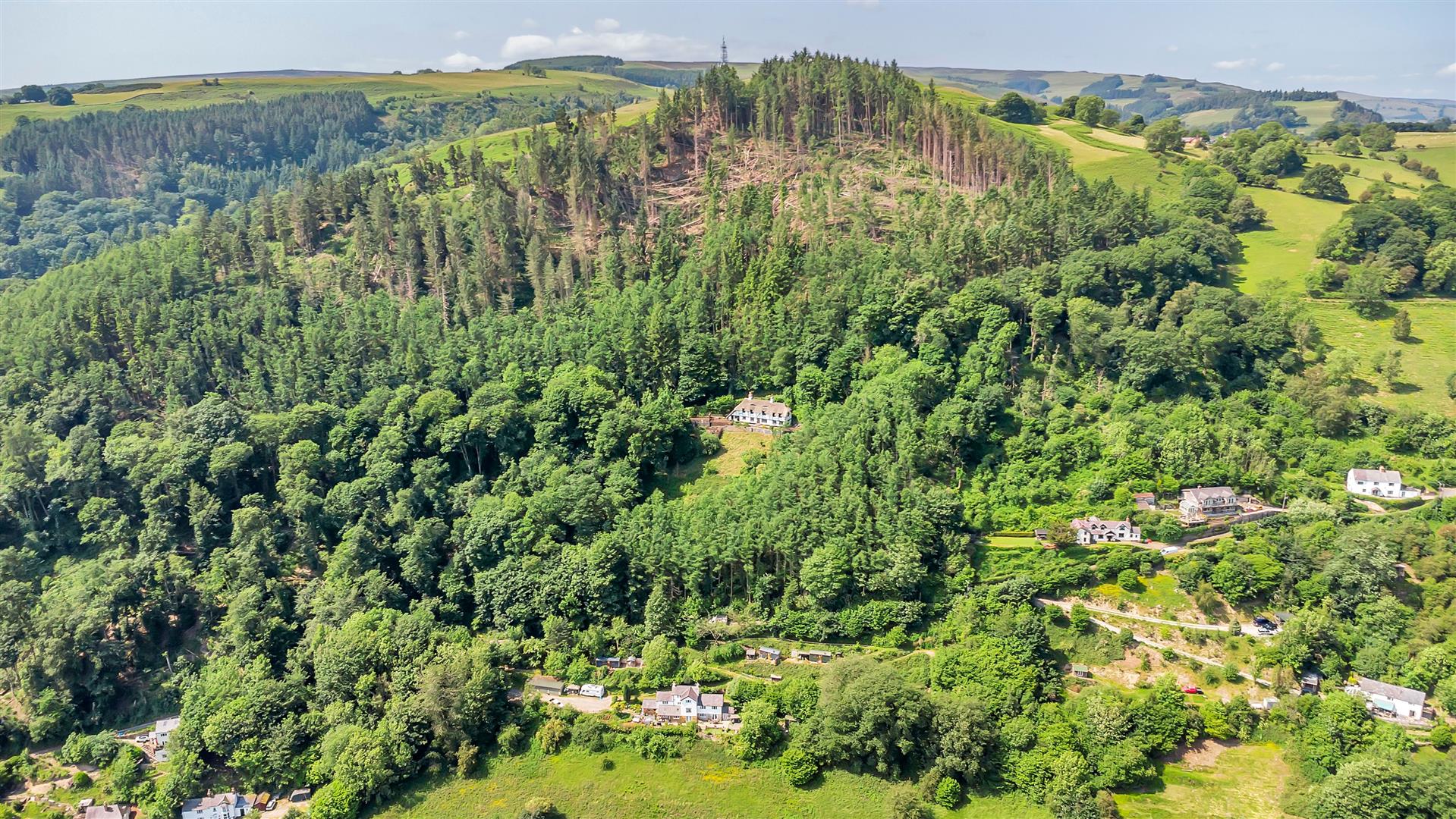 Private driveway providing off road parking with double doors opening onto a decked seating area which leads onto the frontage, part decking leading to the other side of the property which again has a generous decked area to sit and enjoy outdoor entertaining, whilst admiring the far reaching views. Steps from raised decked area adjacent to the front of the property lead to a lower decked tier. Sloping woodland to the front and back of the property,