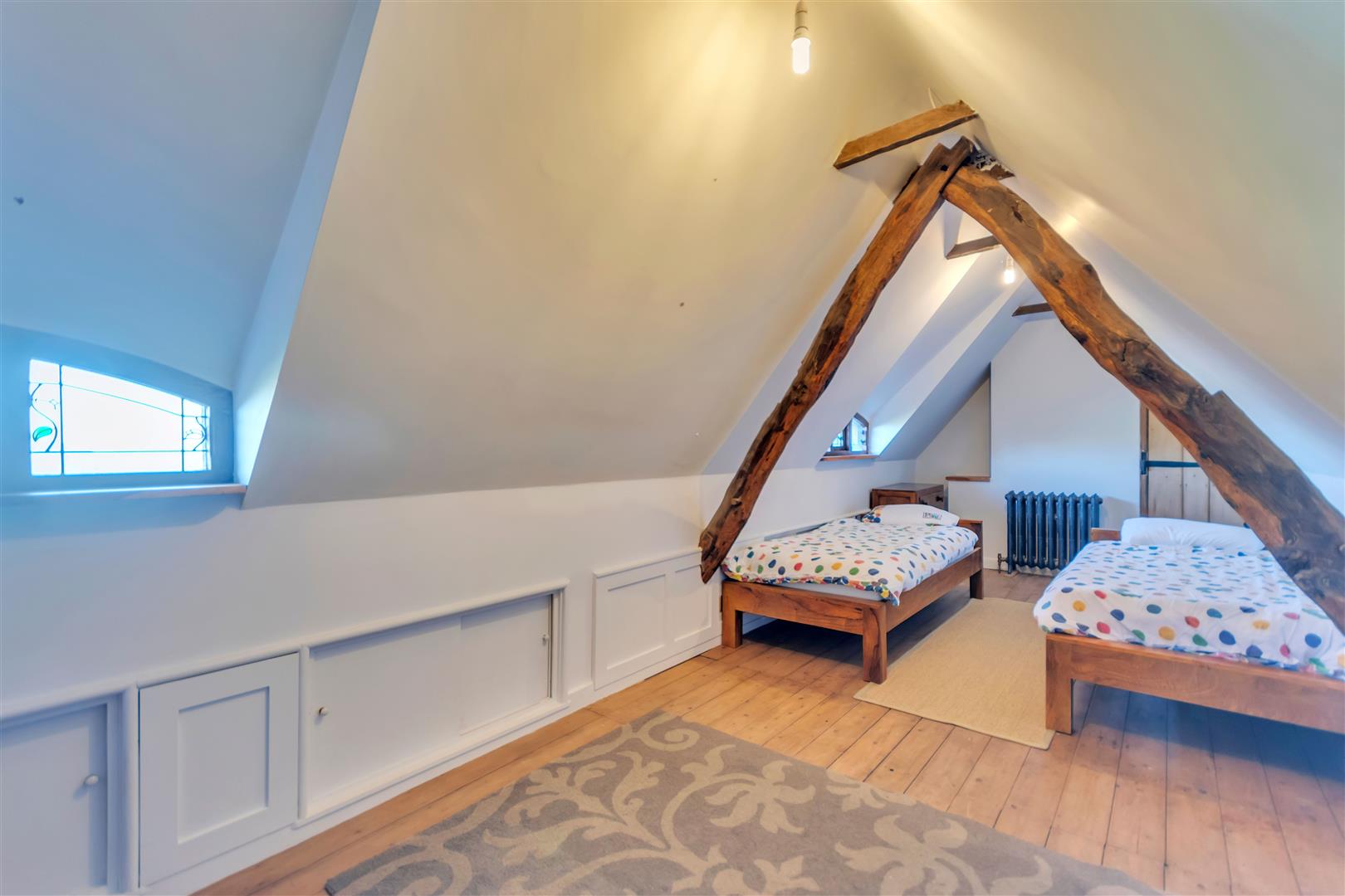 With a small stained glass window to the rear, sloping ceilings to both sides, two cast iron radiators and exposed timber flooring.