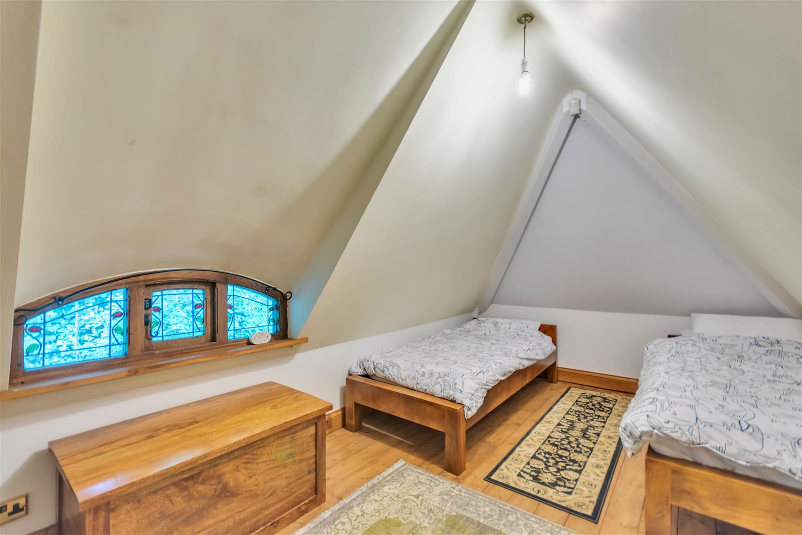 Two stained glass windows to the front, exposed timber flooring and feature timber "A" frame, built in storage cupboards under the eaves, cast iron radiator and door to a large storage cupboard housing the mega flow hot water cylinder and centravac cleaning system.