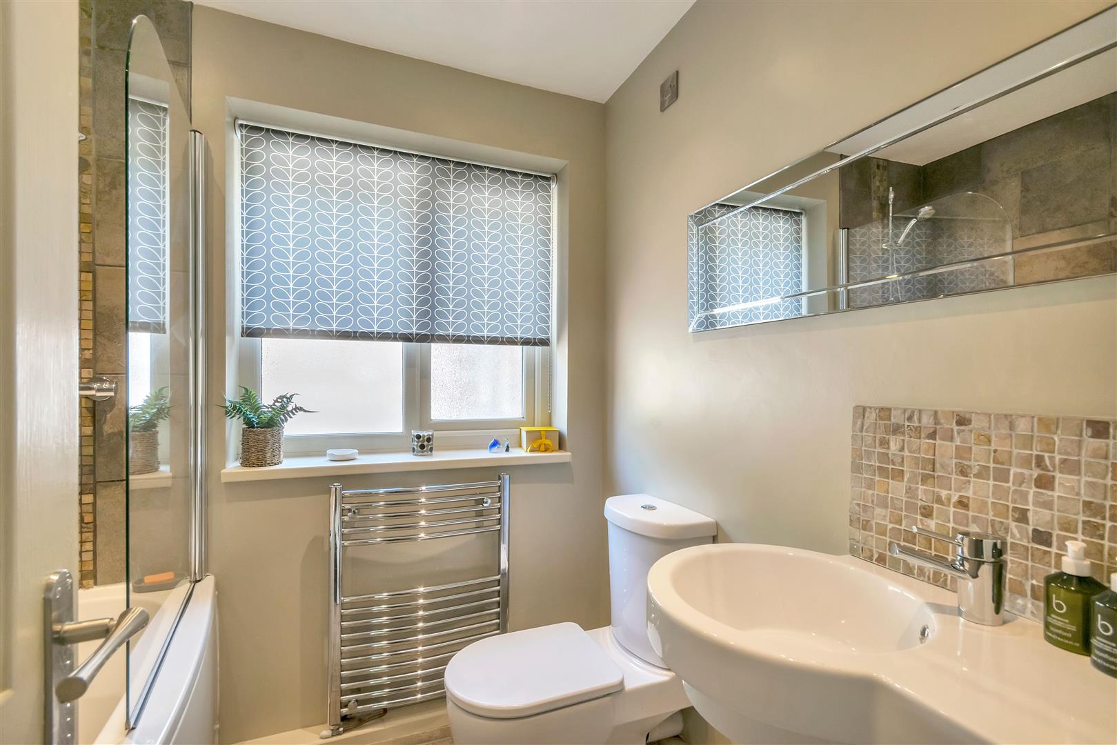 Modern suite of bath with mains shower over and side screen, w.c, wash hand basin, window to front, heated towel rail.