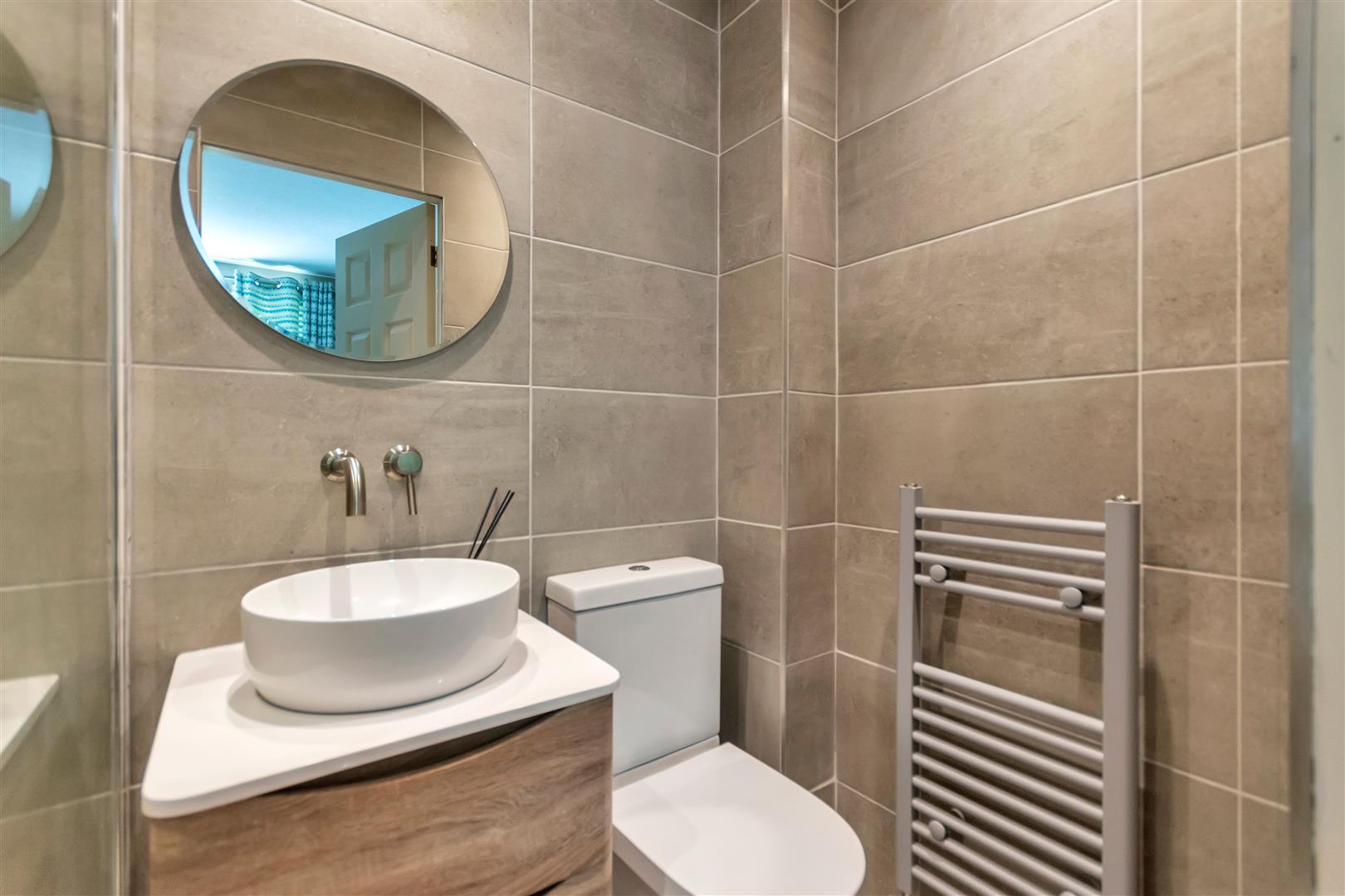 Shower enclosure with electric "Mira" shower, w.c, circular wash hand basin in vanity unit, fully tiled walls and heated towel rail.