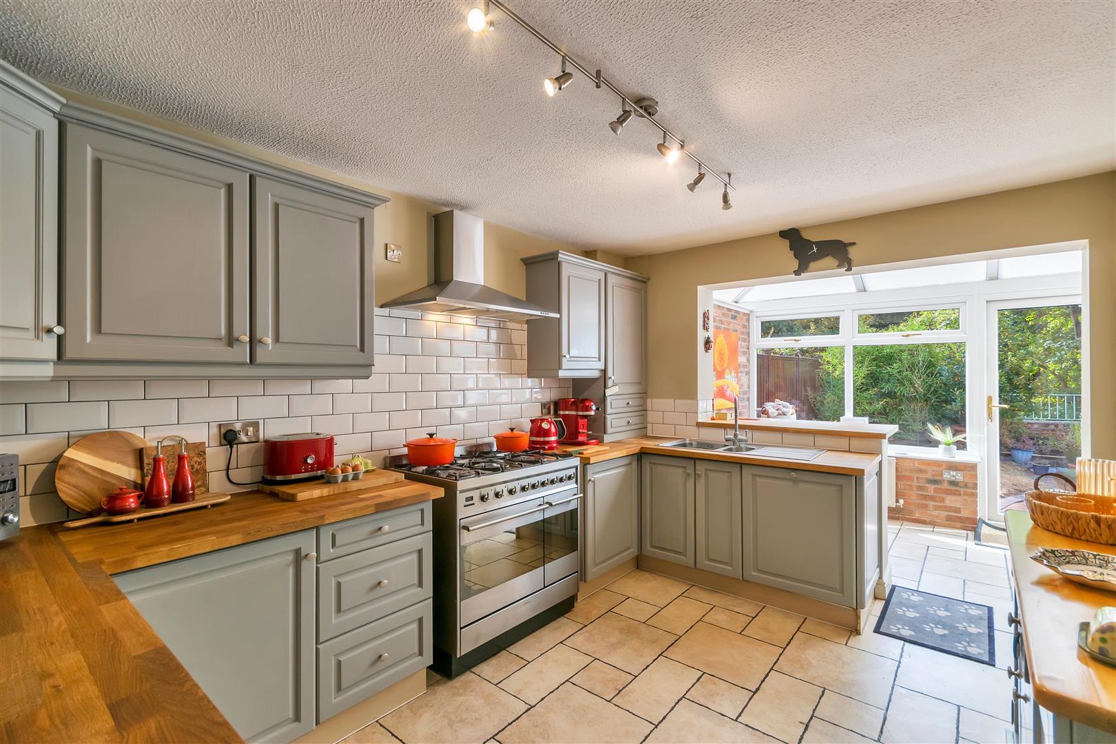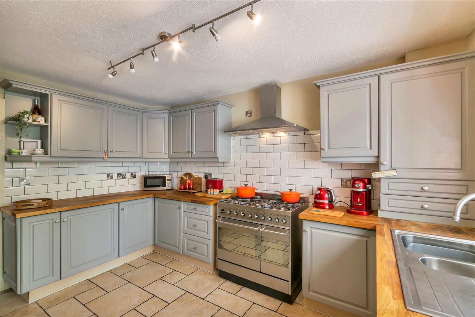 Fitted with a range of base and wall units complimented by work surface areas incorporating sink unit with mixer tap. 6 Ring gas hob with oven and plate warmer below, extractor above, integrated dishwasher, part tiled walls, under unit lighting, breakfast bar, radiator, UPVC window and external door to the rear garden.