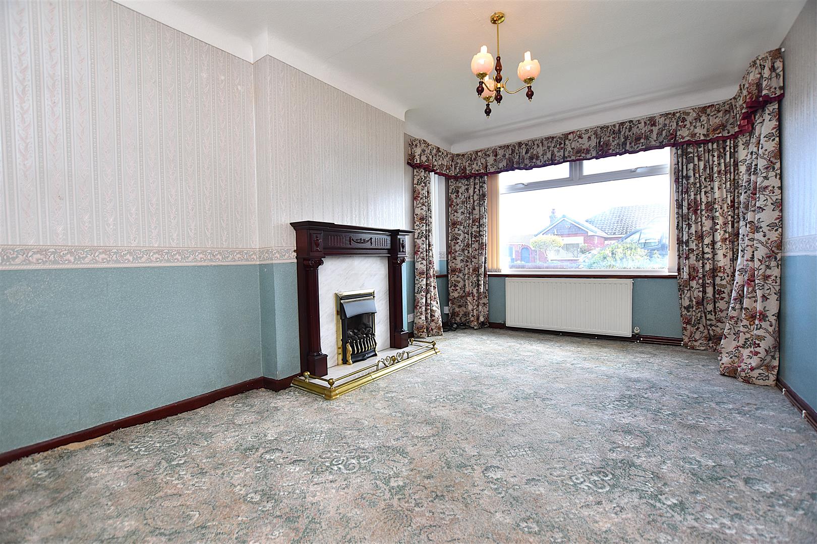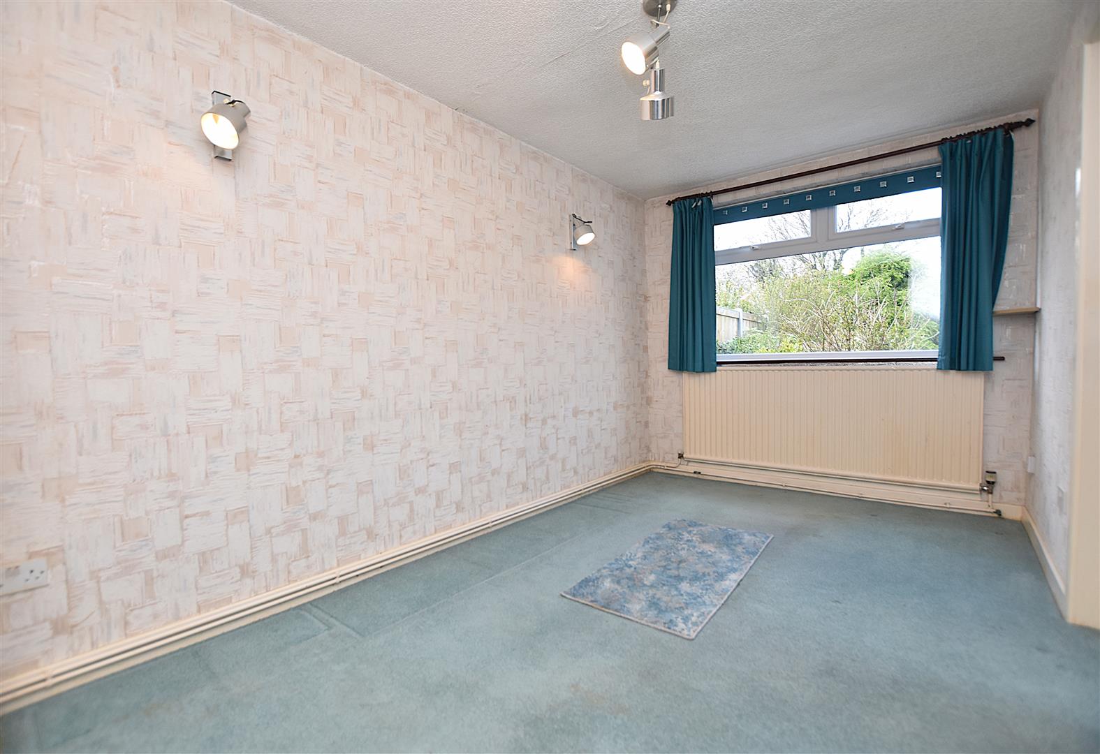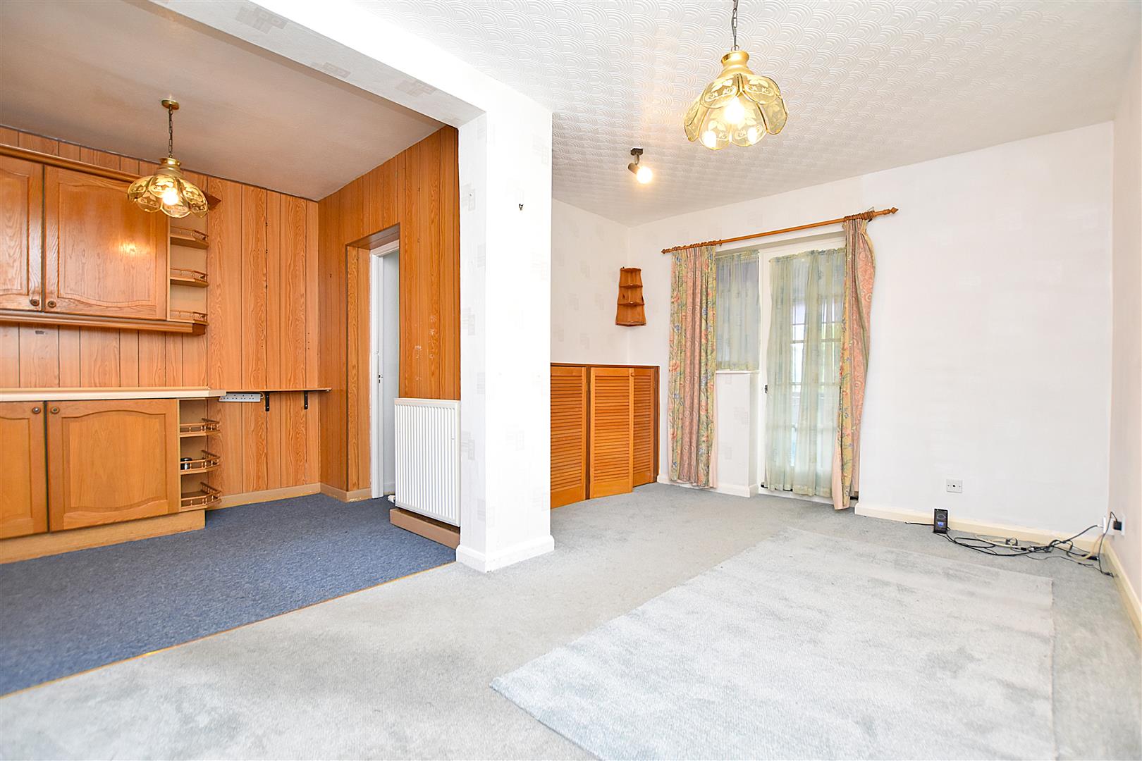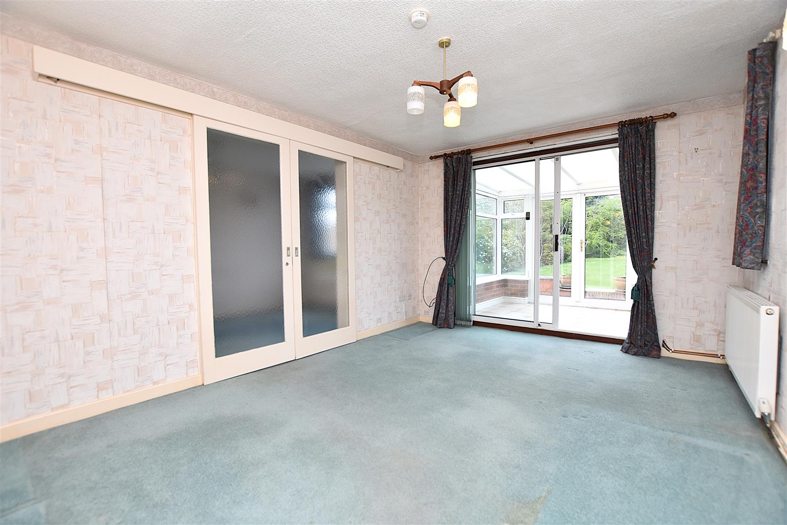 A spacious reception room with wall light points, radiator and double glazed sliding patio doors opening to: