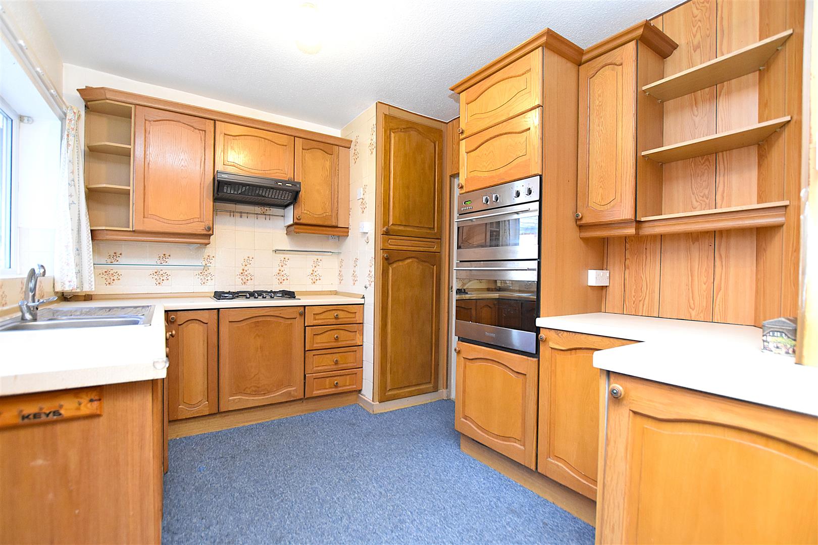 Fitted with a range of base and wall units with work surface areas incorporating a 1 1/2 bowl stainless steel single drainer sink unit with mixer tap and upvc double glazed window above, four ring gas hob with extractor hood above, double oven/grill, integrated fridge, integrated freezer, radiator and open aspect to:
