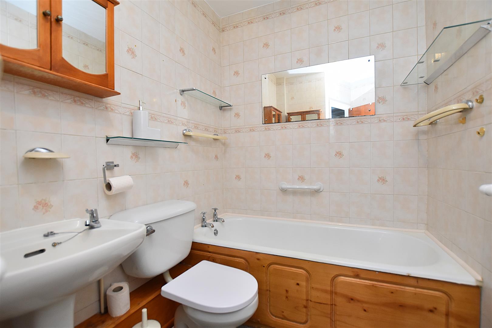 Appointed with a pedestal wash basin, low flush w.c, bath, fully tiled walls and extractor fan.
