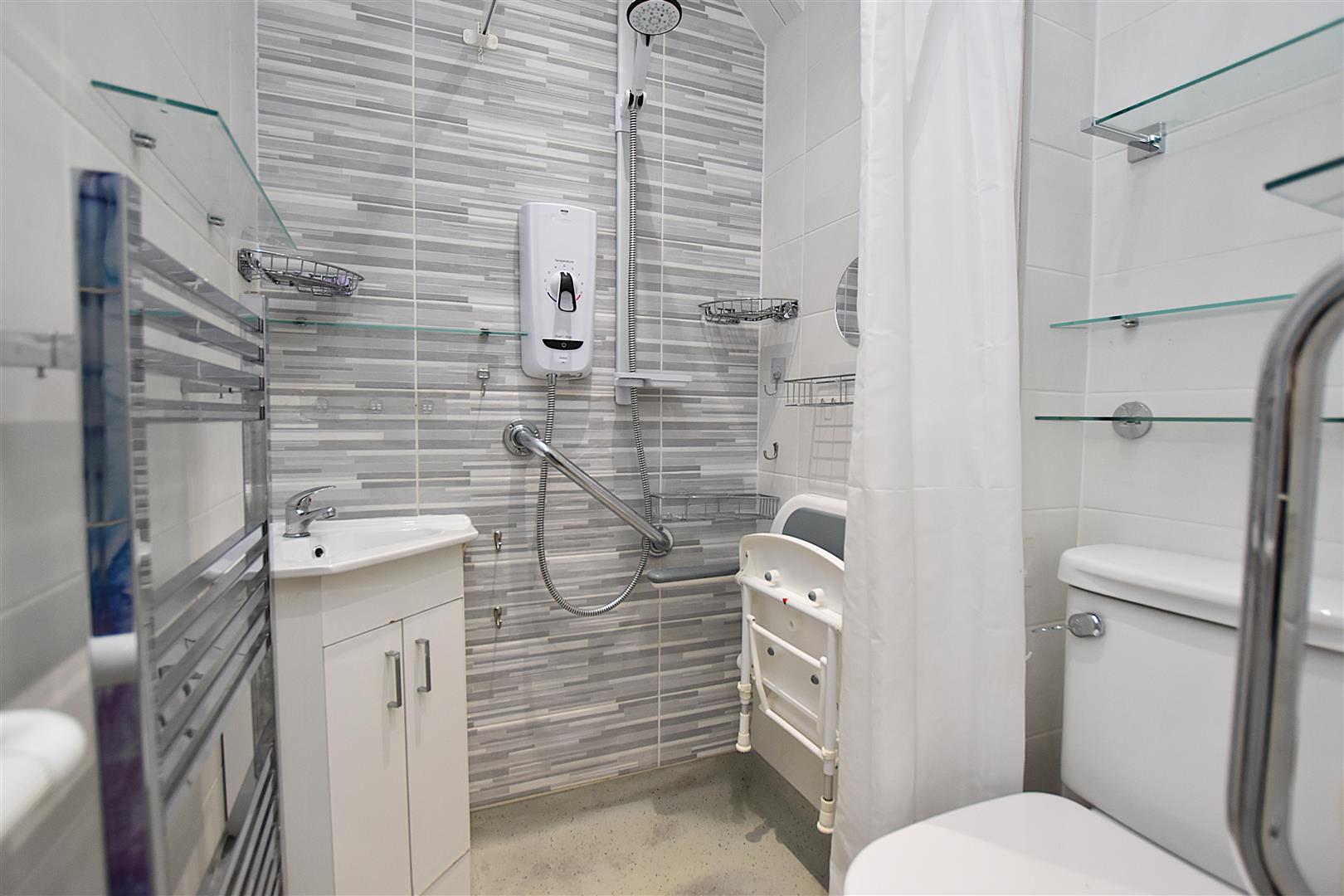 Appointed with a low flush w.c, corner wash basin with vanity unit, shower area with electric shower unit, non-slip flooring, chrome heated towel rail, inset ceiling lighting, extractor fan and fully tiled walls.