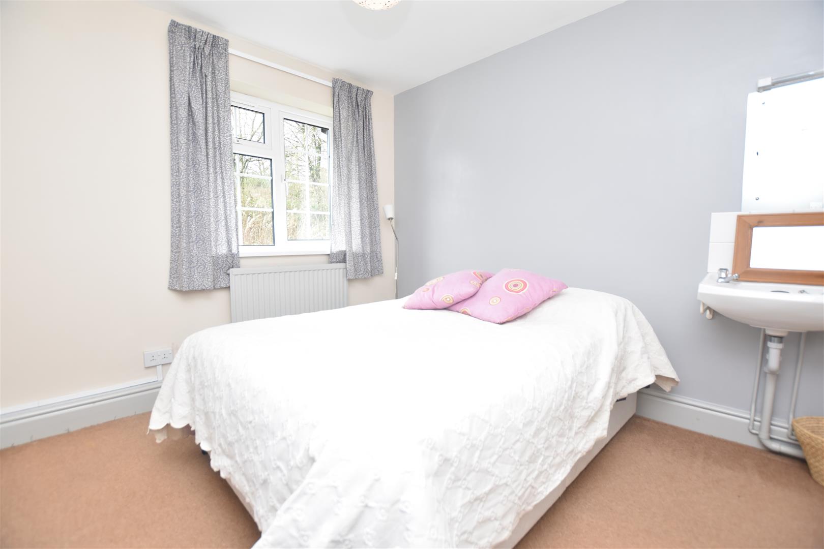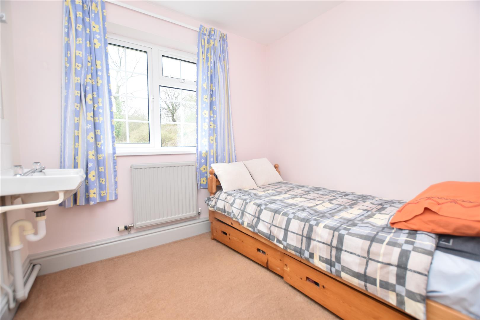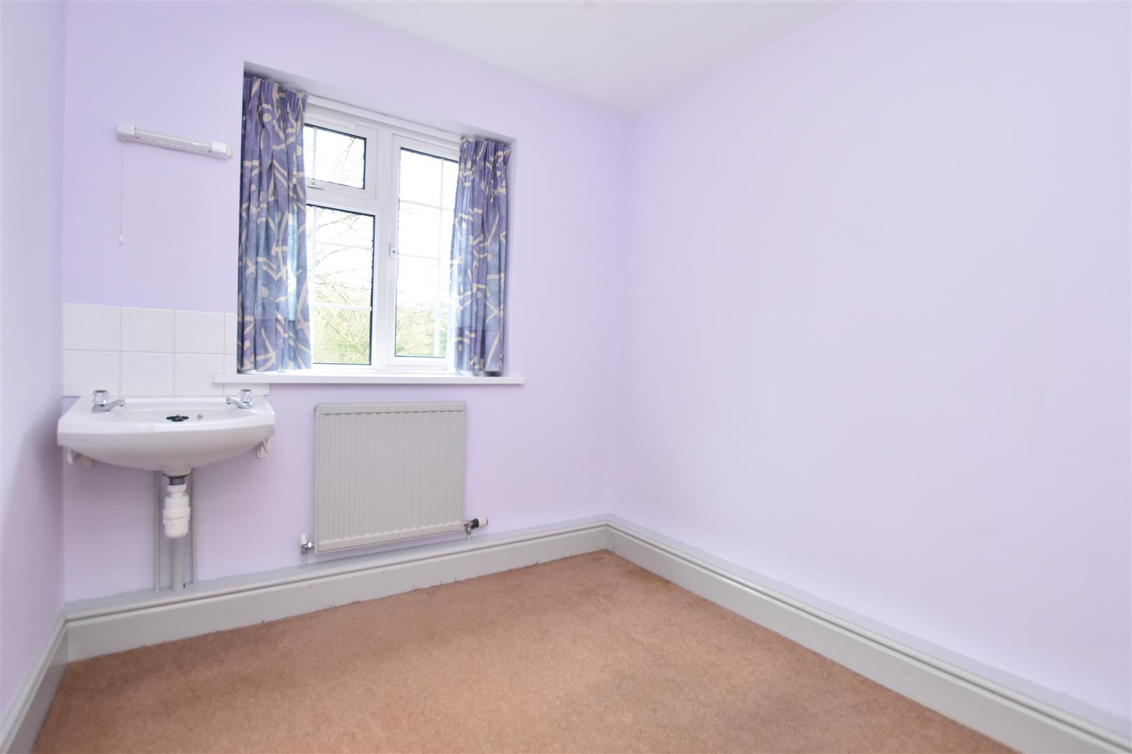 Upvc double glazed window overlooking the rear garden, radiator, wash basin with tiled splashback and built-in wardrobe with upvc double glazed window.
