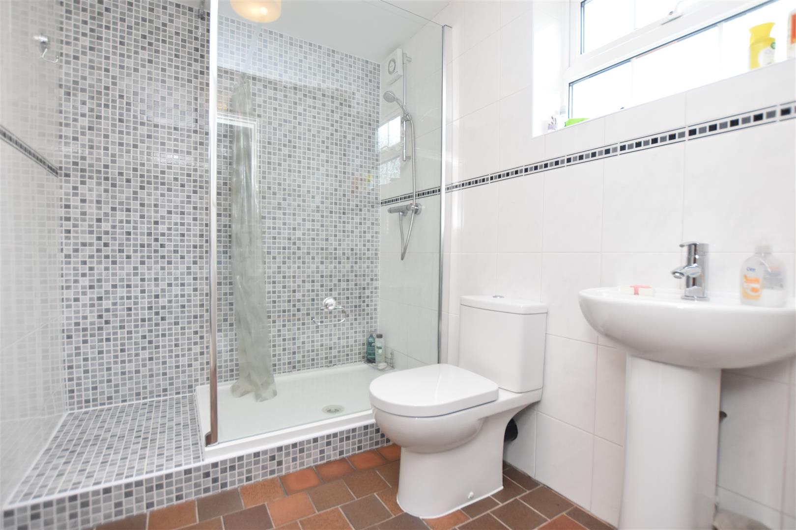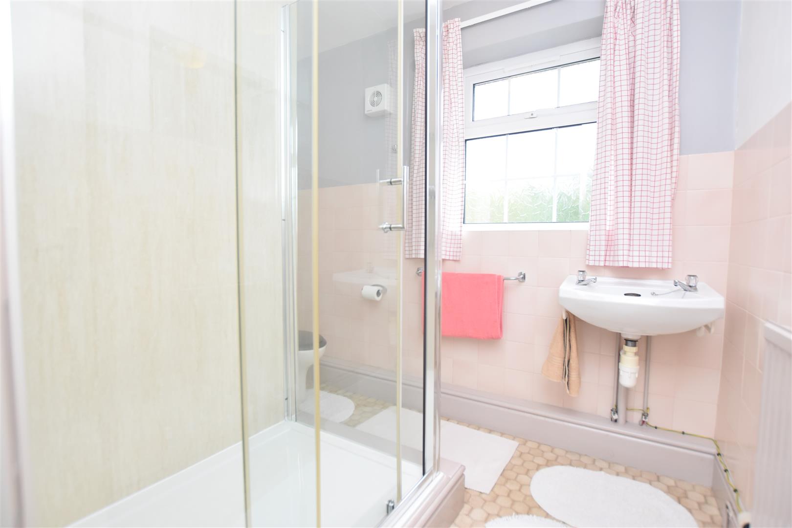 Appointed with pedestal wash basin with mixer tap, close coupled w.c, shower enclosure with mains thermostatic shower and splash screen, fully tiled walls, tiled flooring, extractor fan, upvc double glazed window and radiator.