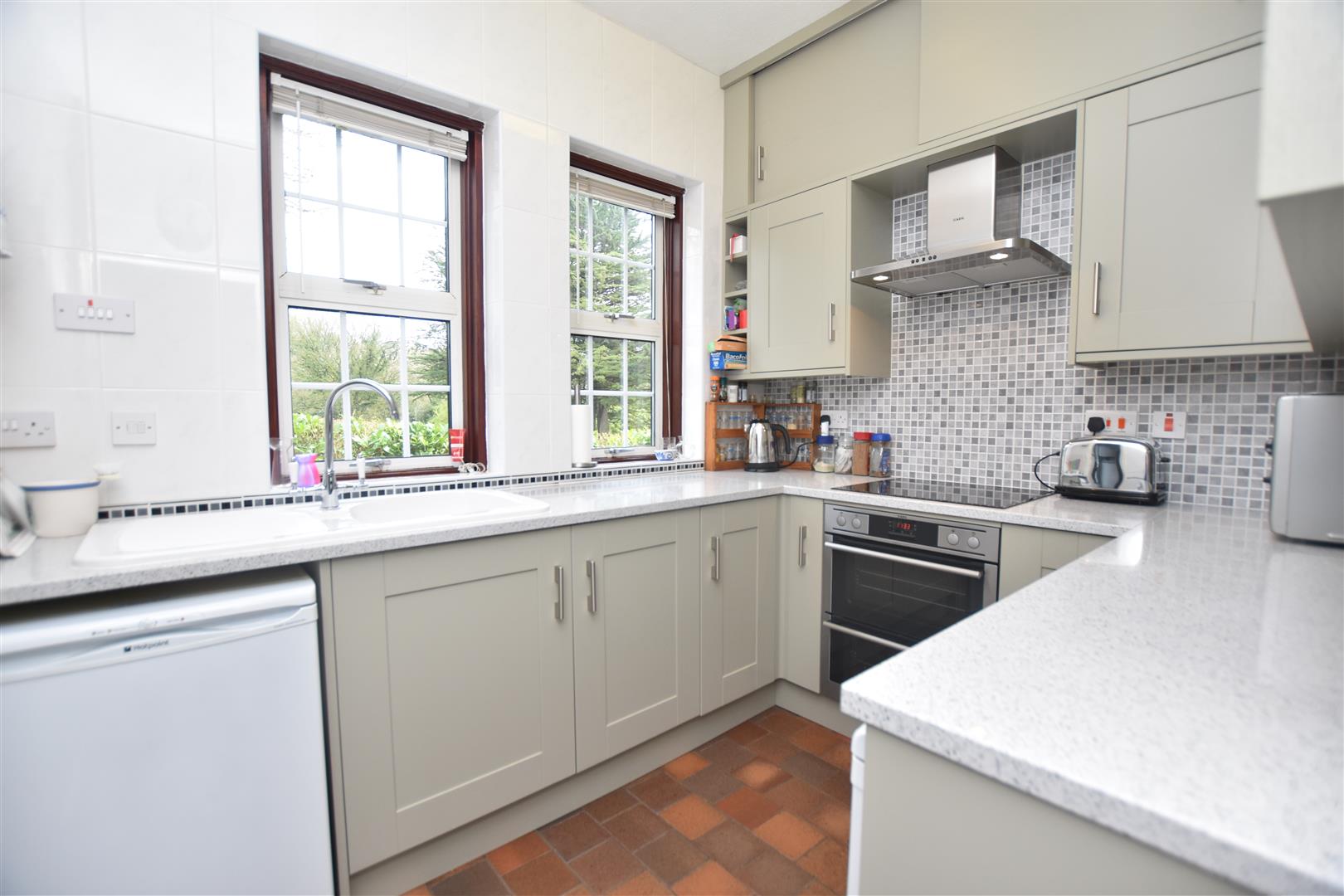 Fitted with a shaker style range of modern base and wall cupboards complimented by granite work surface areas incorporating an inset ceramic single drainer sink unit with mixer tap and two aluminium double glazed windows above, AEG induction hob, double oven/grill below and stainless steel extractor hood above, part tiled walls, space for under counter fridge, provision for dishwasher and quarry tiled flooring. An internal door opens into: