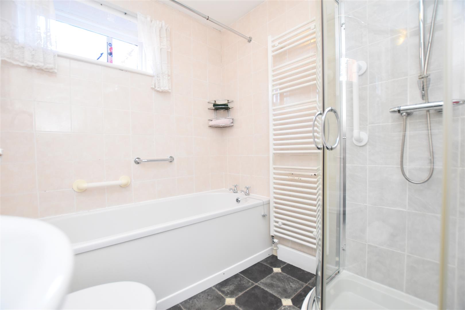 Appointed with a pedestal wash basin, low flush w.c, corner shower enclosure with mains thermostatic shower, bath, fully tiled walls, window and heated towel rail.