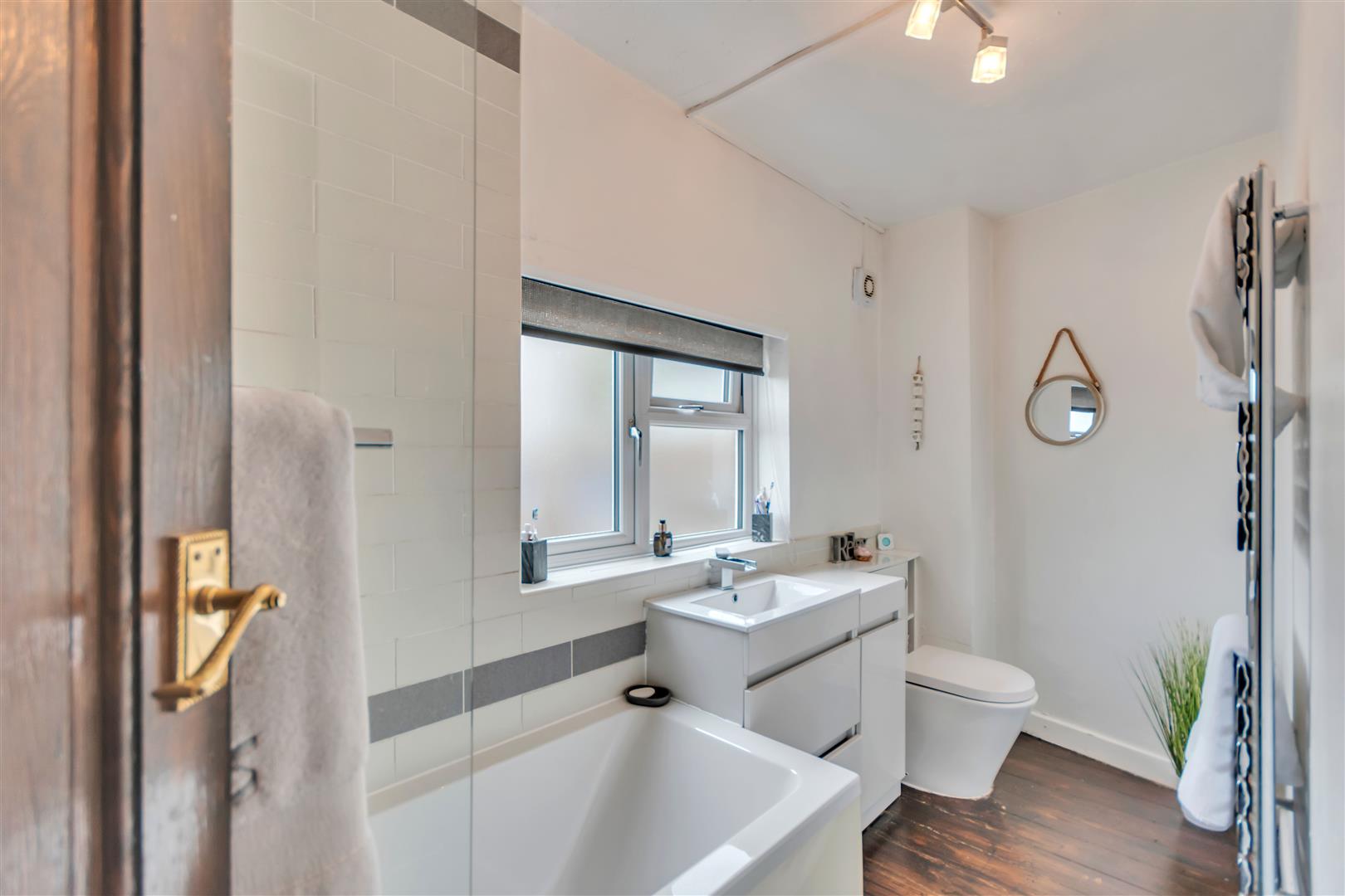 Modern suite of bath with mains shower over and side screen, wash hand basin with storage drawers below, w.c, window, heated towel rail, extractor fan.