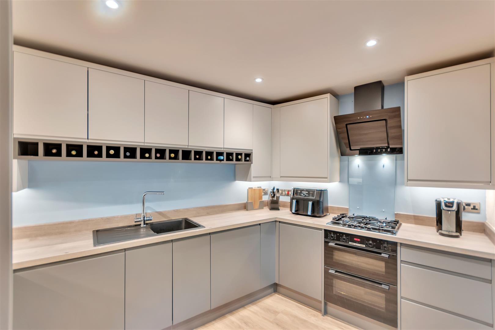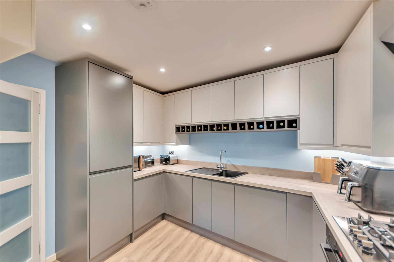 Fitted with a range of base and wall units complimented by work surface areas incorporating sink unit with mixer tap over, wine storage above. Gas hob with electric oven and grill below and modern extractor above, Integrated fridge/freezer, under unit lighting, spotlights to ceiling, radiator.