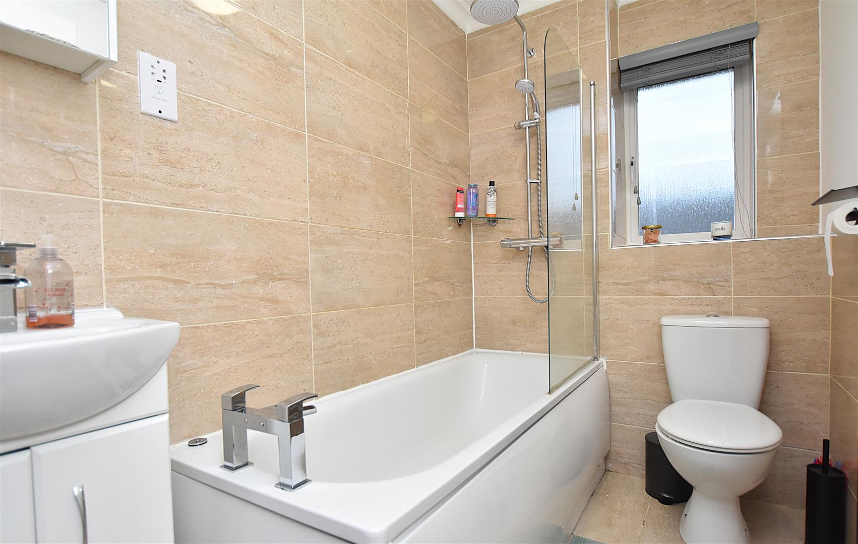 Appointed with a white suite of low flush w.c, wash basin with waterfall style mixer tap set within vanity unit, bath with mains thermostatic shower, Drench style shower head and splash screen, chrome heated towel rail, part tiled walls, tiled flooring, extractor fan and upvc double glazed window.