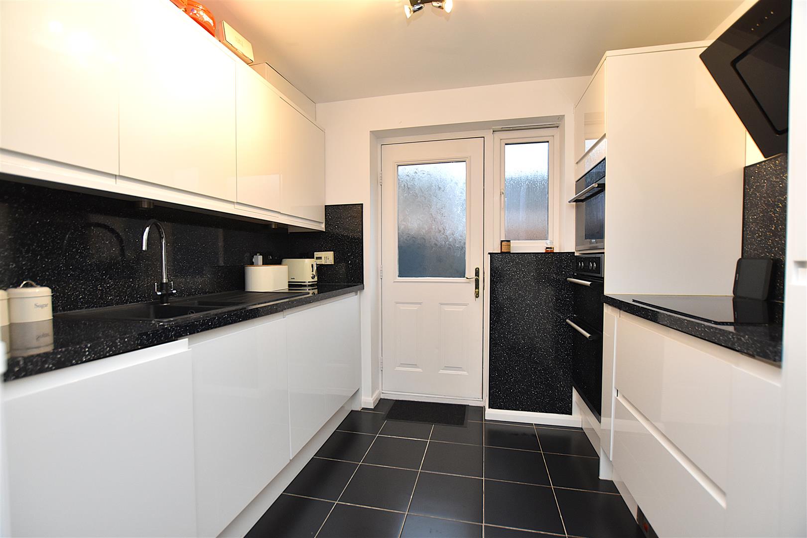 Appointed with a gloss white fronted range of base and wall cupboards complimented by work surface areas incorporating a black 1 1/2 bowl sink unit with mixer tap, Bosch induction four ring hob with angled extractor hood above and splashback, double oven/grill, integrated microwave, integrated fridge freezer, cutlery and pan drawers, integrated washing machine, integrated dishwasher, wine rack, upvc double glazed window, tiled flooring, concealed gas central heating boiler and part glazed external door to the rear garden.