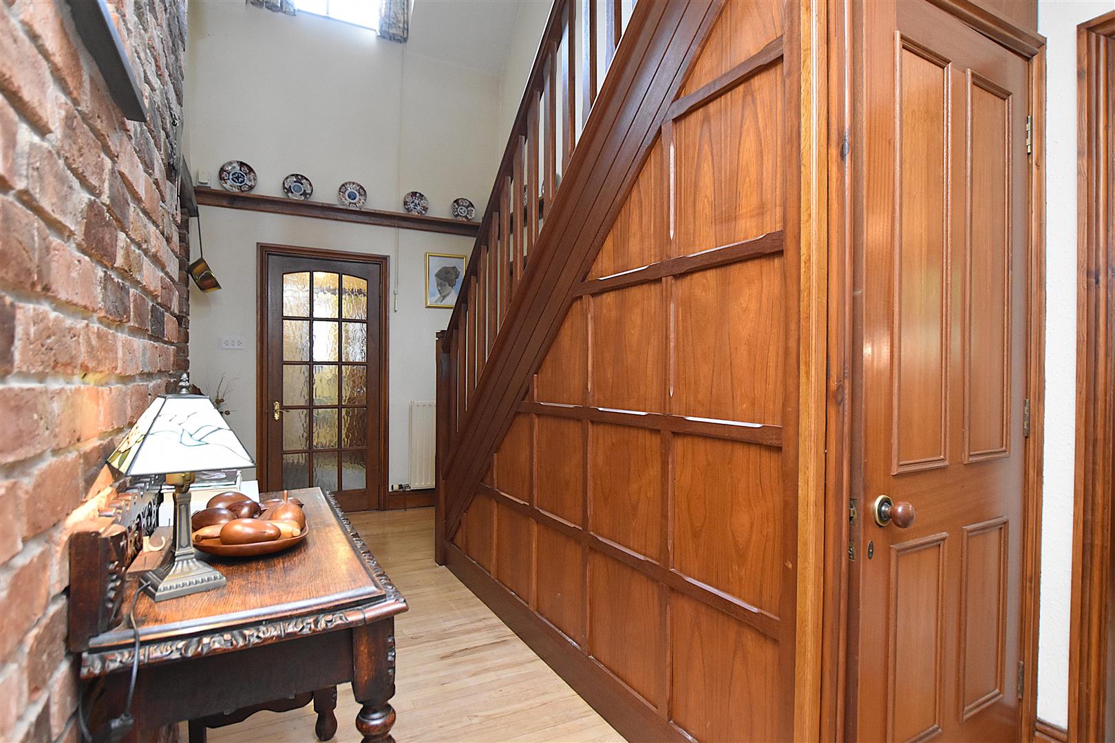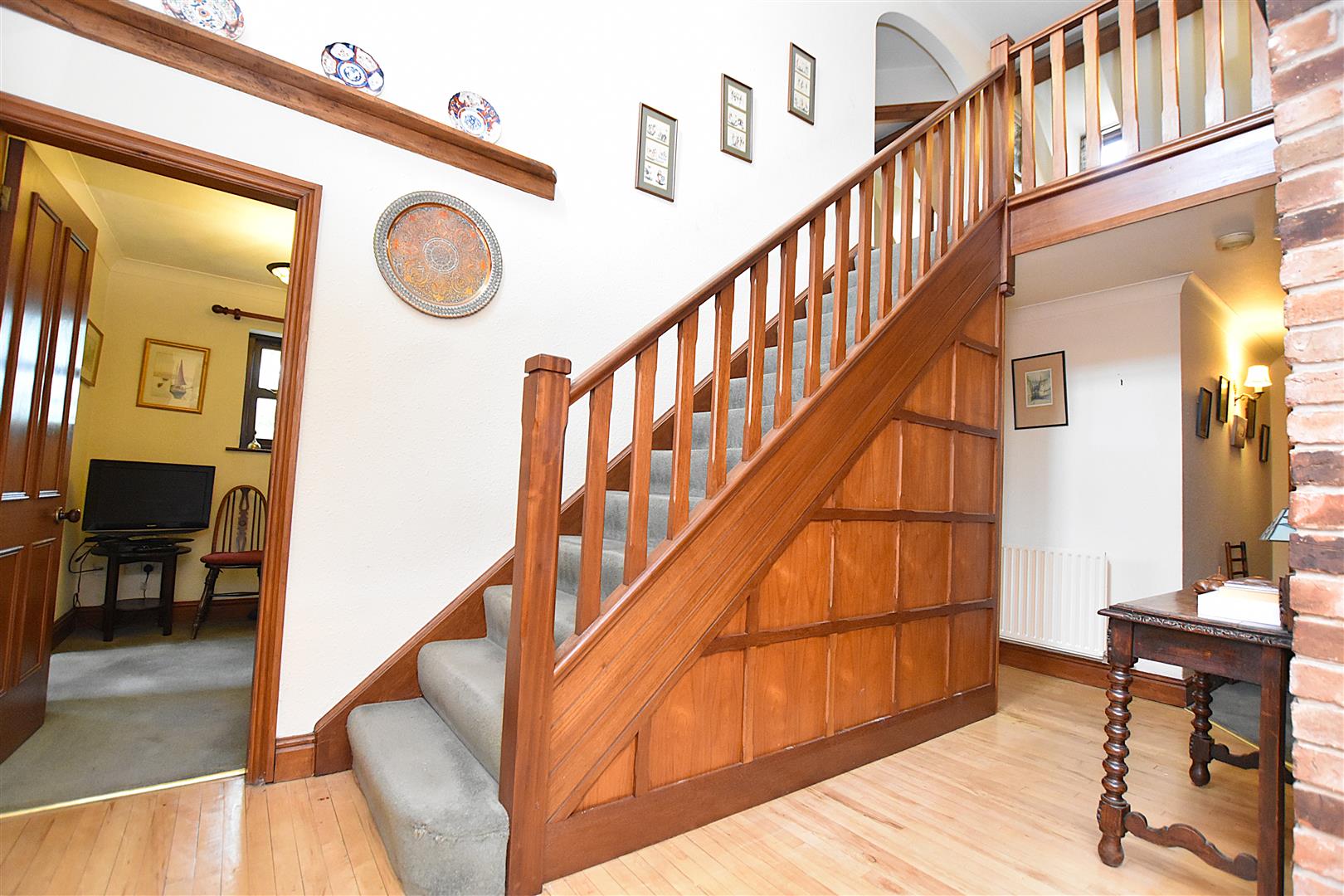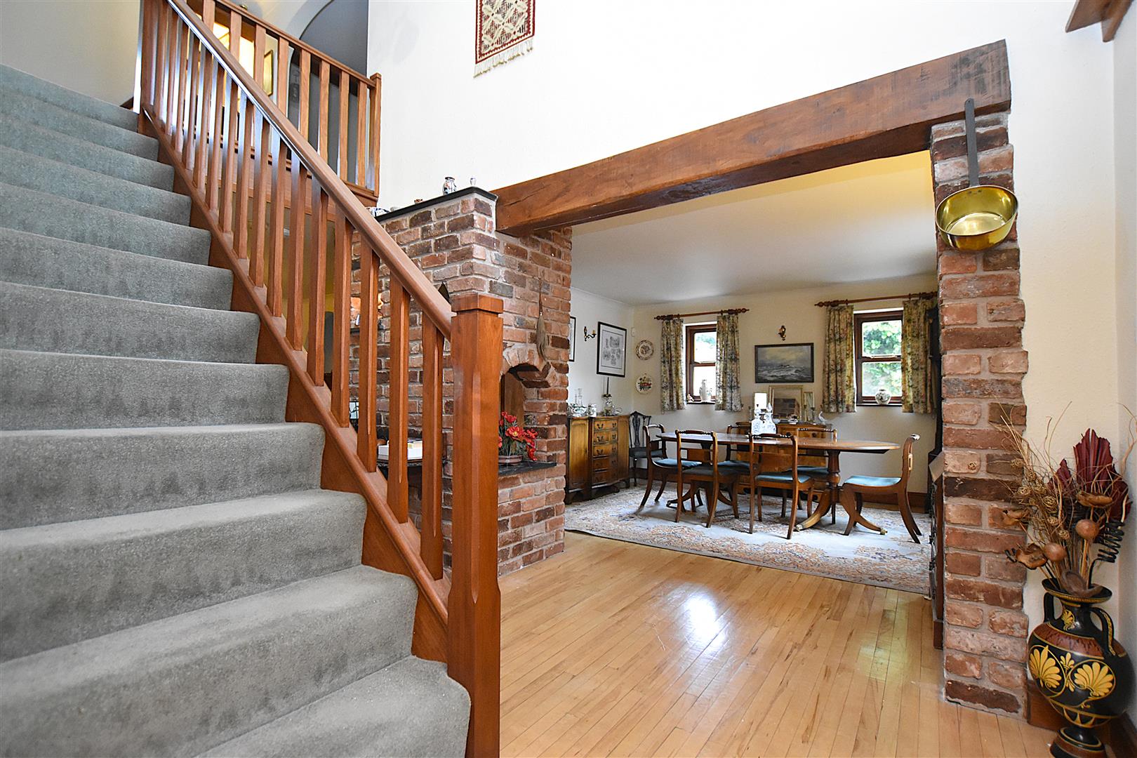 An impressive double height ceiling with Iroko hardwood staircase with galleried landing, maple flooring, exposed brickwork, radiator, beams to ceiling, internal archway, stained glass window, coving to ceiling, useful storage cupboard and access to: