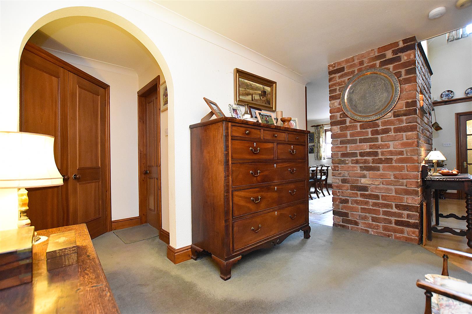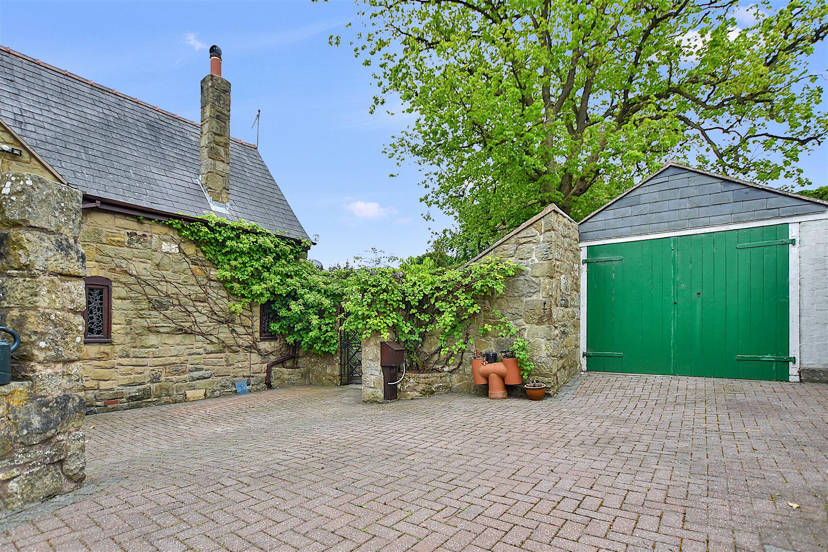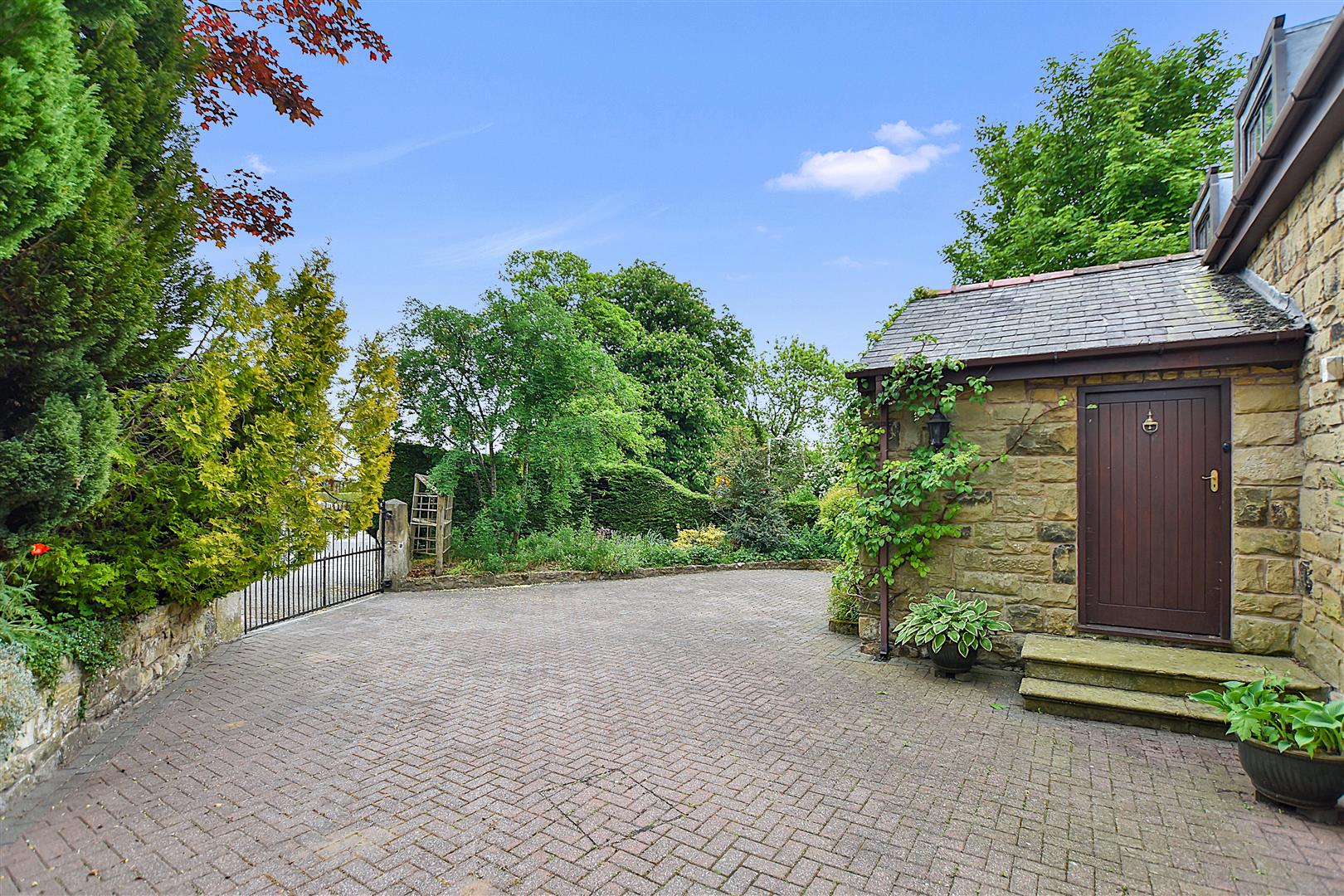 The property is approached through a stone pillared gated entrance leading to a brick paved driveway providing ample parking and guest parking alongside established flowerbeds and lawned area. The driveway continues under the stone archway to: