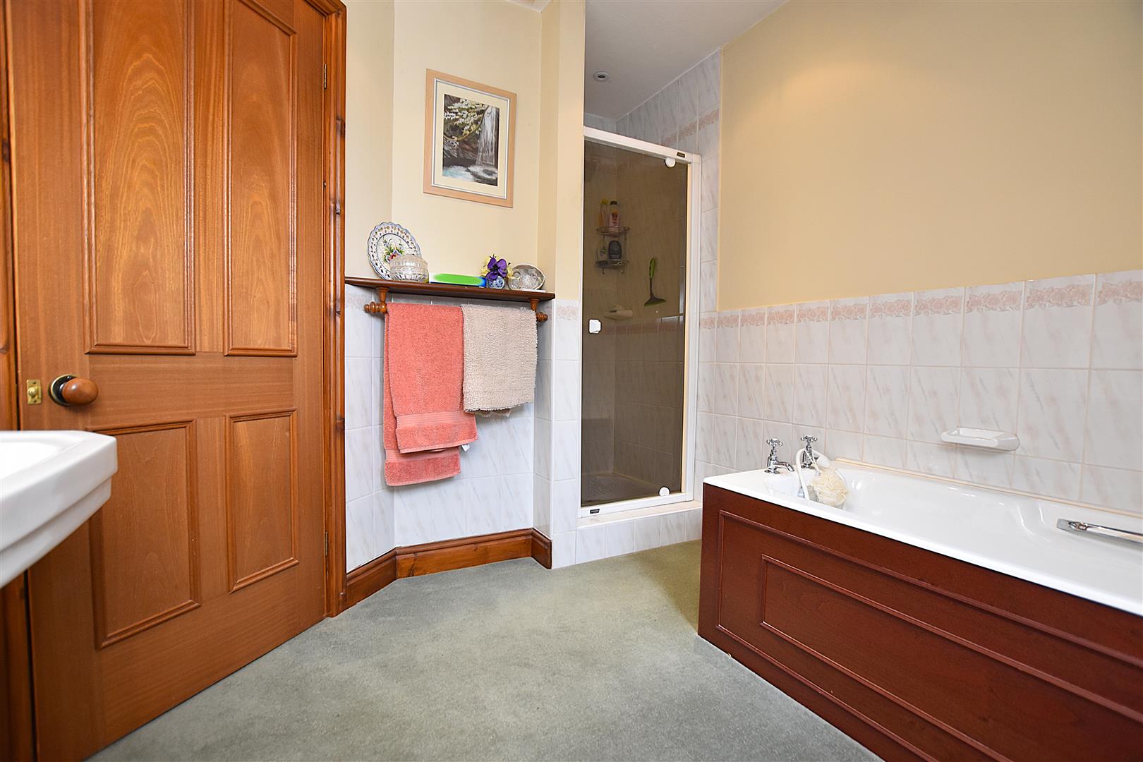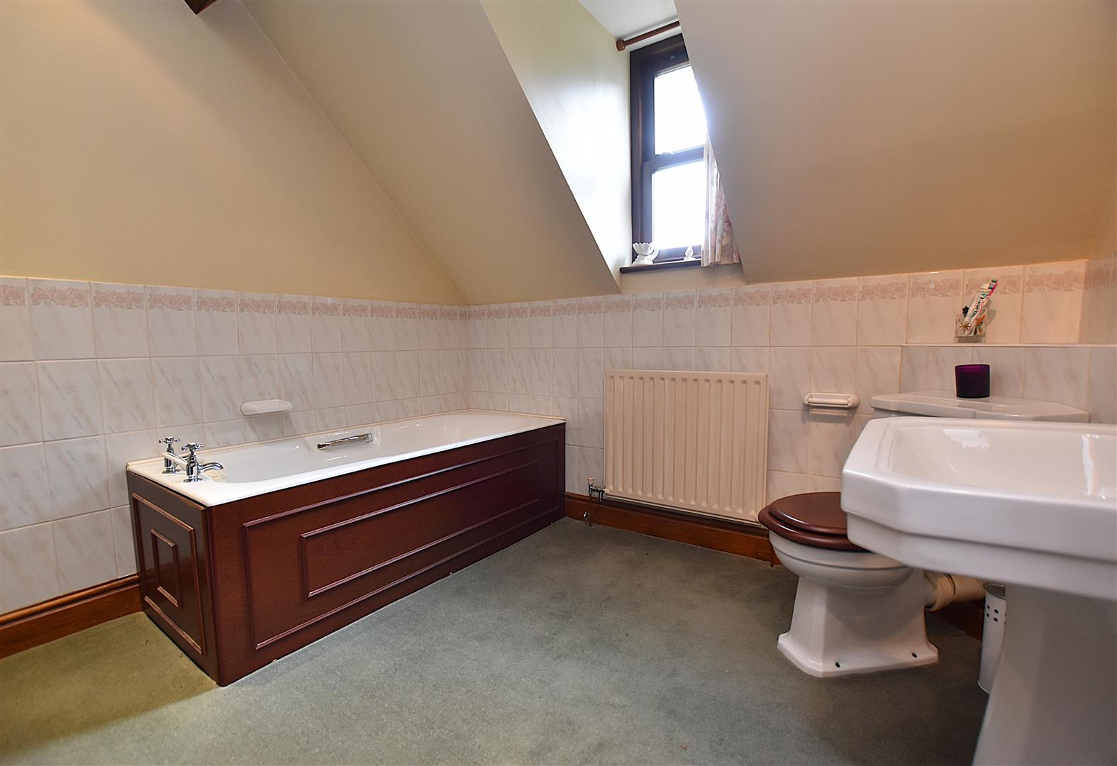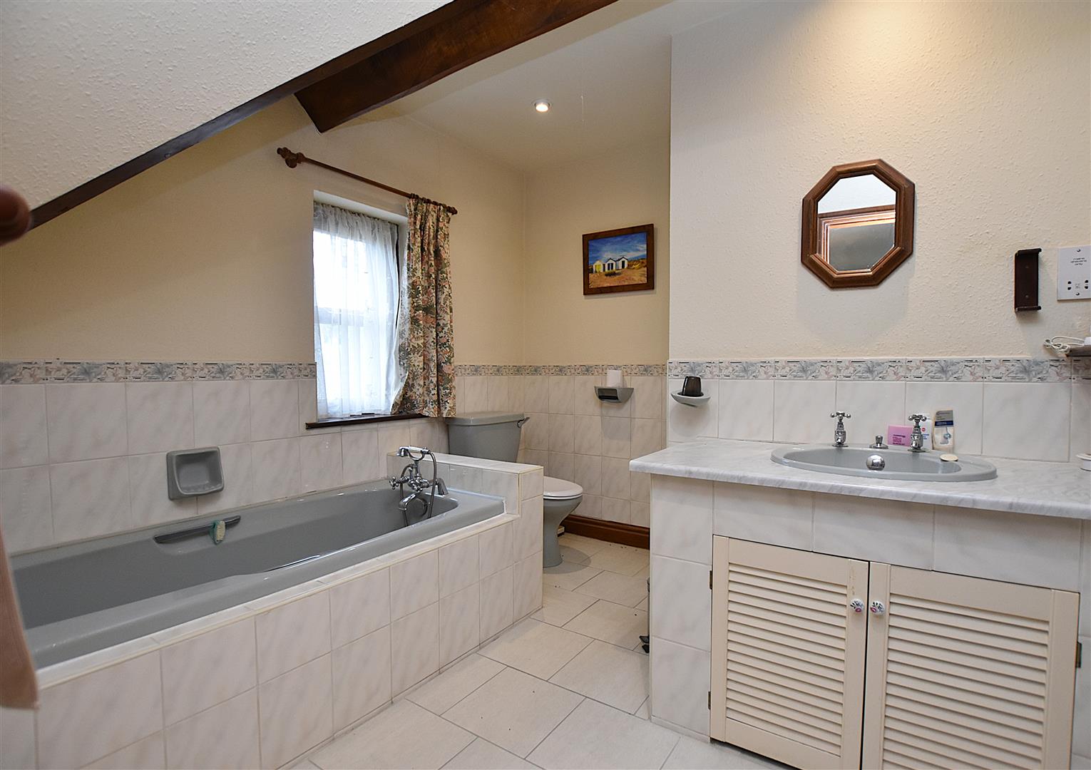 Appointed with a pedestal wash basin, low flush w.c, bath, shower enclosure with mains thermostatic shower, part tiled walls, radiator, double glazed window, ceiling hatch to roof space, inset ceiling spotlights and shaver socket.
