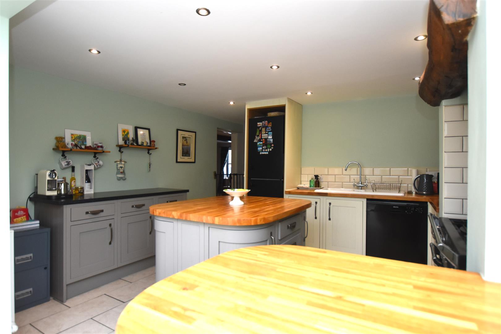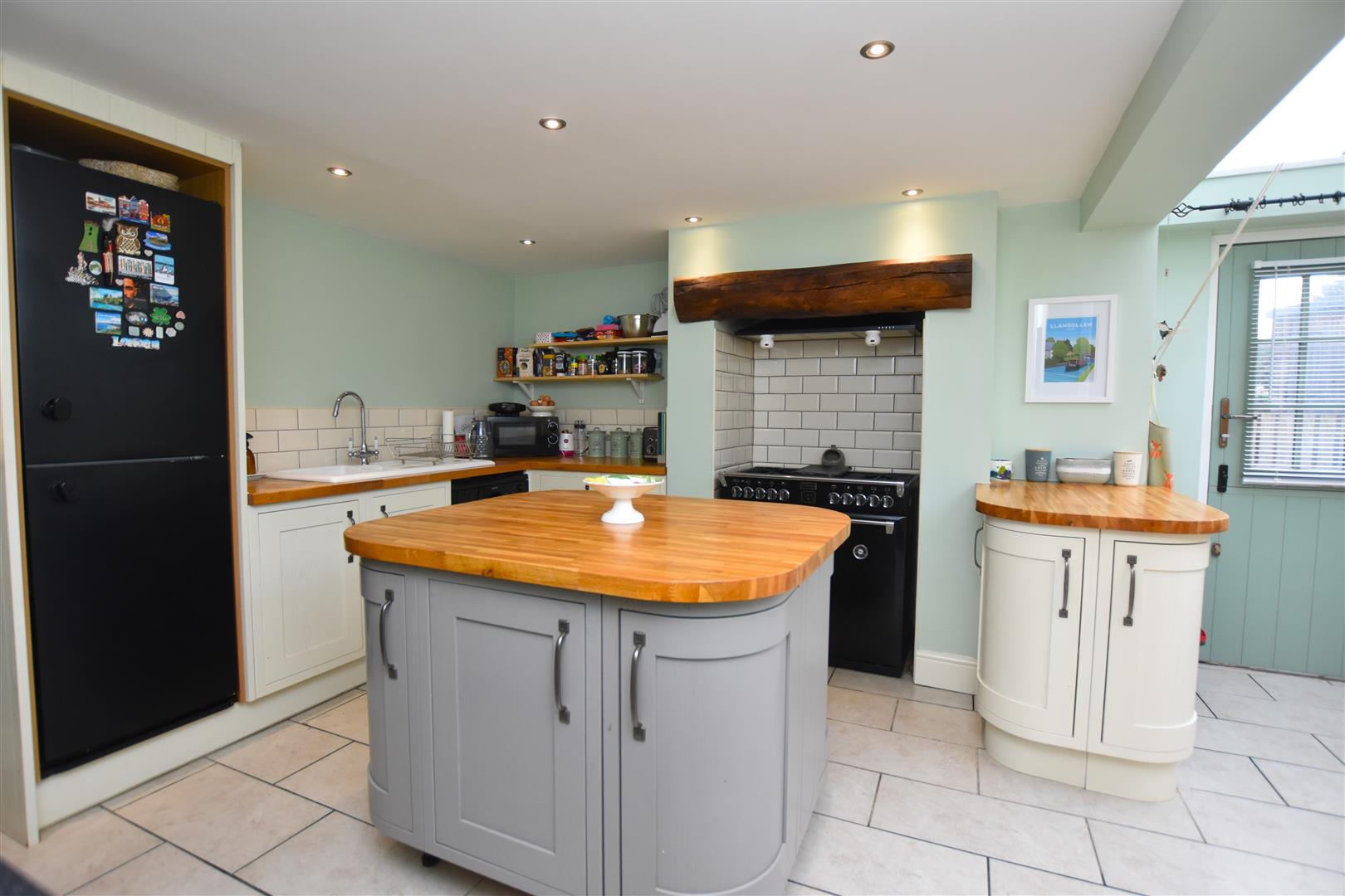 Beautifully appointed with a shaker style range of base and wall cupboards with flush fitting doors complimented by wood block work surface areas incorporating a ceramic 1 1/2 bowl sink unit with mixer tap, Range cooker set within chimney breast with extractor hood and timber beam above, plumbing for dishwasher, housing for fridge freezer, central island providing additional store cupboards and work surface areas, part glass panelled roof providing an excellent degree of natural light over the seating area, tiled flooring, inset ceiling spotlights, external composite stable door, radiator and useful storage cupboard with plumbing for washing machine.