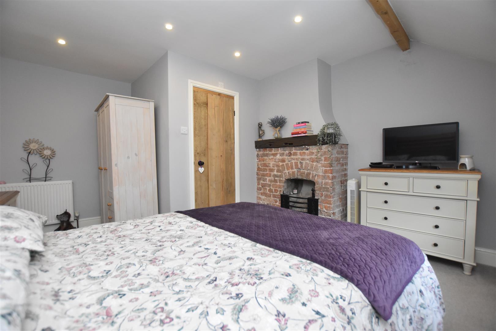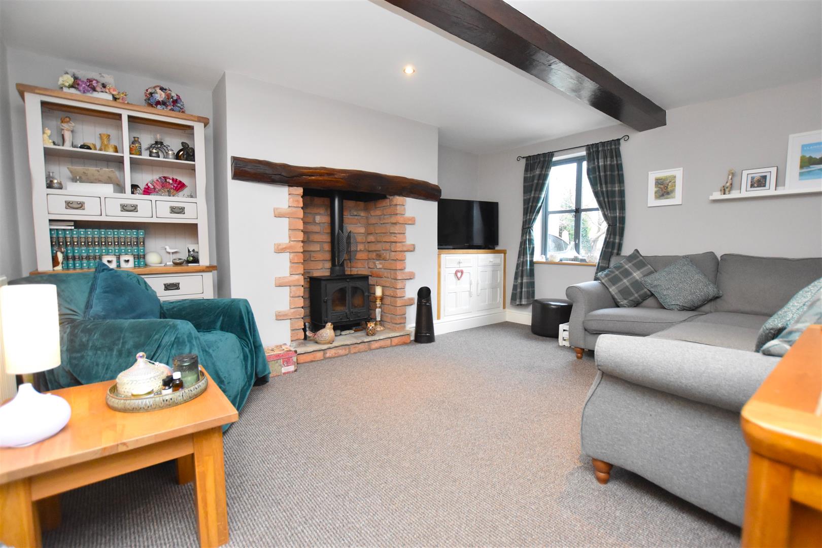 An oak cottage style door opens to the well proportioned reception room with double glazed window to front, log burner set within chimney breast with timber mantel, stone hearth and exposed brickwork, beam to ceiling, radiator and storage cupboard within recess.