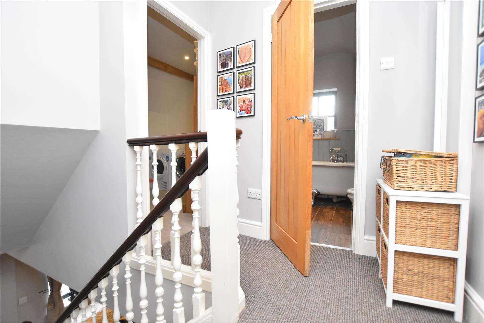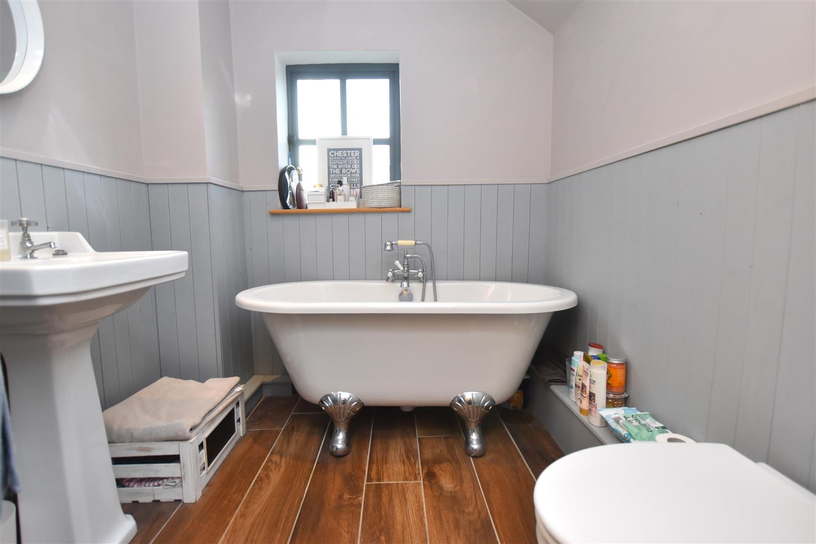 Beautifully appointed with a free standing roll top bath with central mixer tap and hand held shower take-off, w.c with concealed cistern, pedestal wash basin, chrome heated towel rail, double glazed window, inset ceiling spotlights, extractor fan, tiled flooring and timber wall panels to half height.
