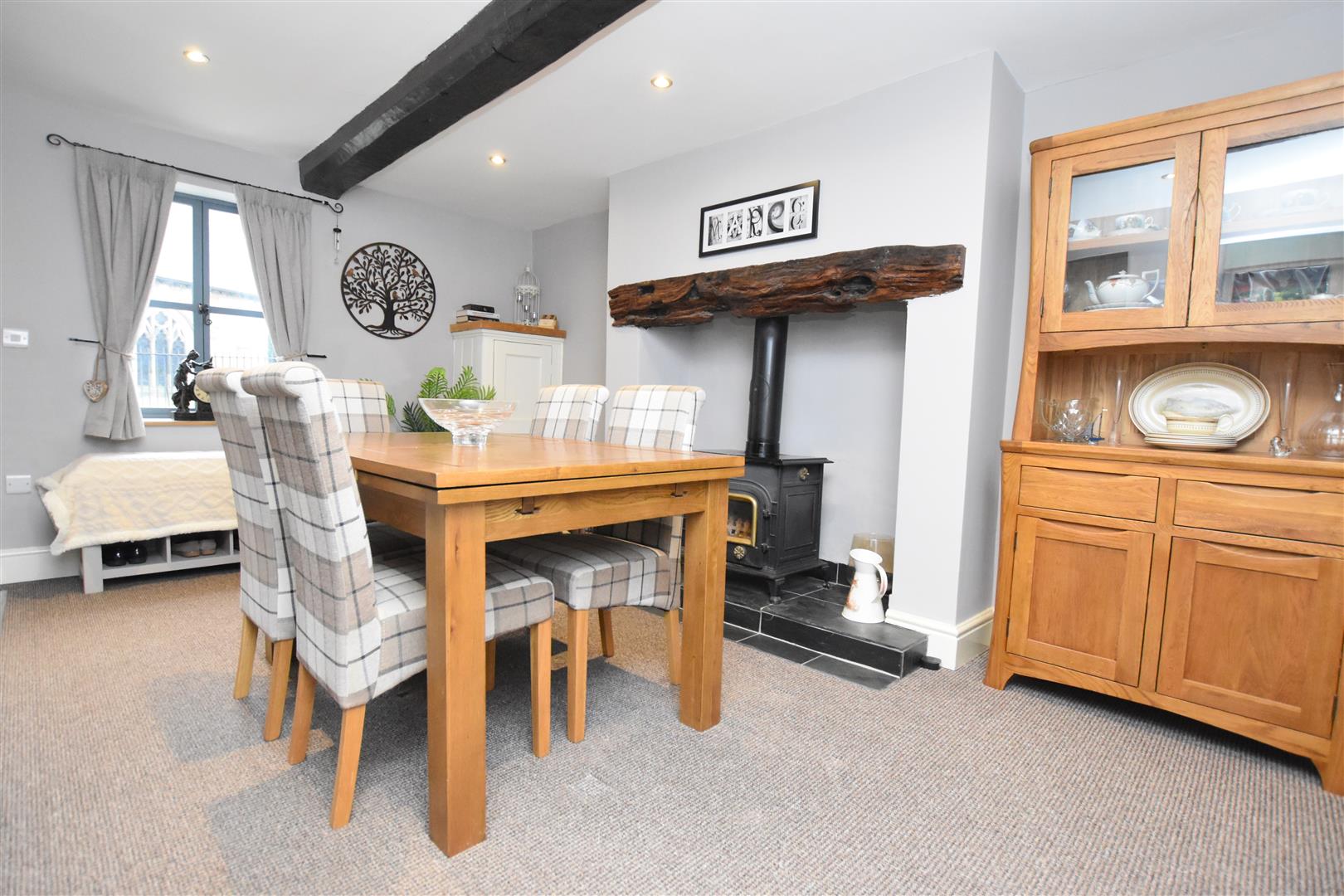 Partial tiled flooring, staircase to first floor landing, log burner set within an Inglenook style fireplace with slate hearth, inset ceiling spotlights, exposed beams, double glazed window to front with oak sill, storage cupboard and radiator.