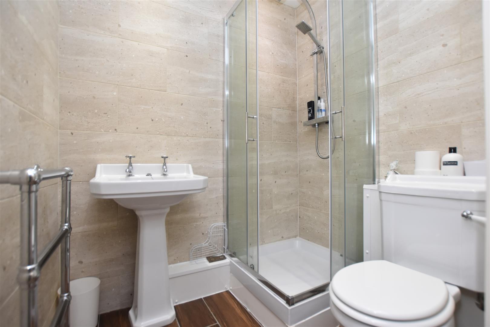 Appointed with a low flush w.c, pedestal wash basin, shower enclosure with mains thermostatic shower and Drench style head, chrome heated towel rail, fully tiled walls, tiled flooring, inset spotlights and Velux roof light window.