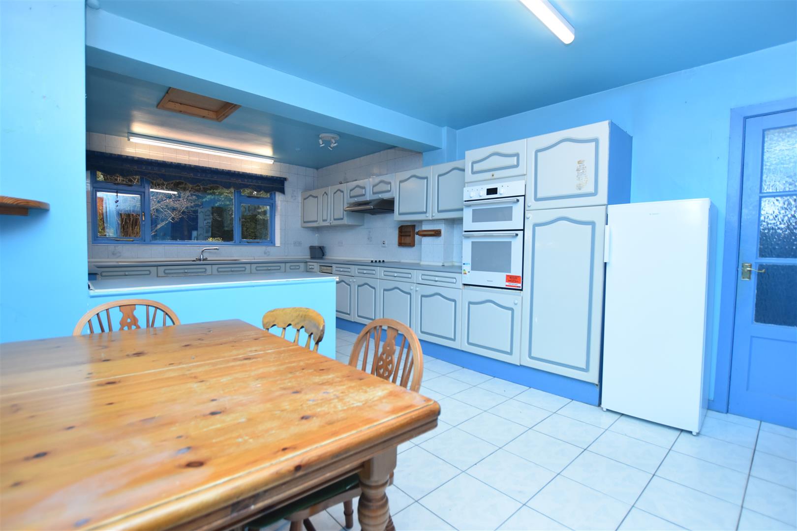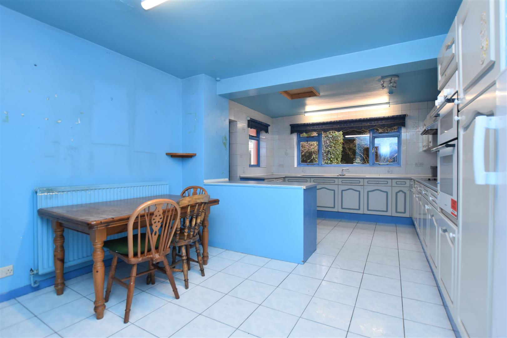 Fitted with an extensive range of base and wall cupboards complimented by work surface areas incorporating a twin bowl stainless steel sink unit with mixer tap and window above overlooking the rear garden, part tiled walls, tiled flooring, four ring electric hob with extractor hood above, double oven/grill, two radiators and built-in storage cupboard.