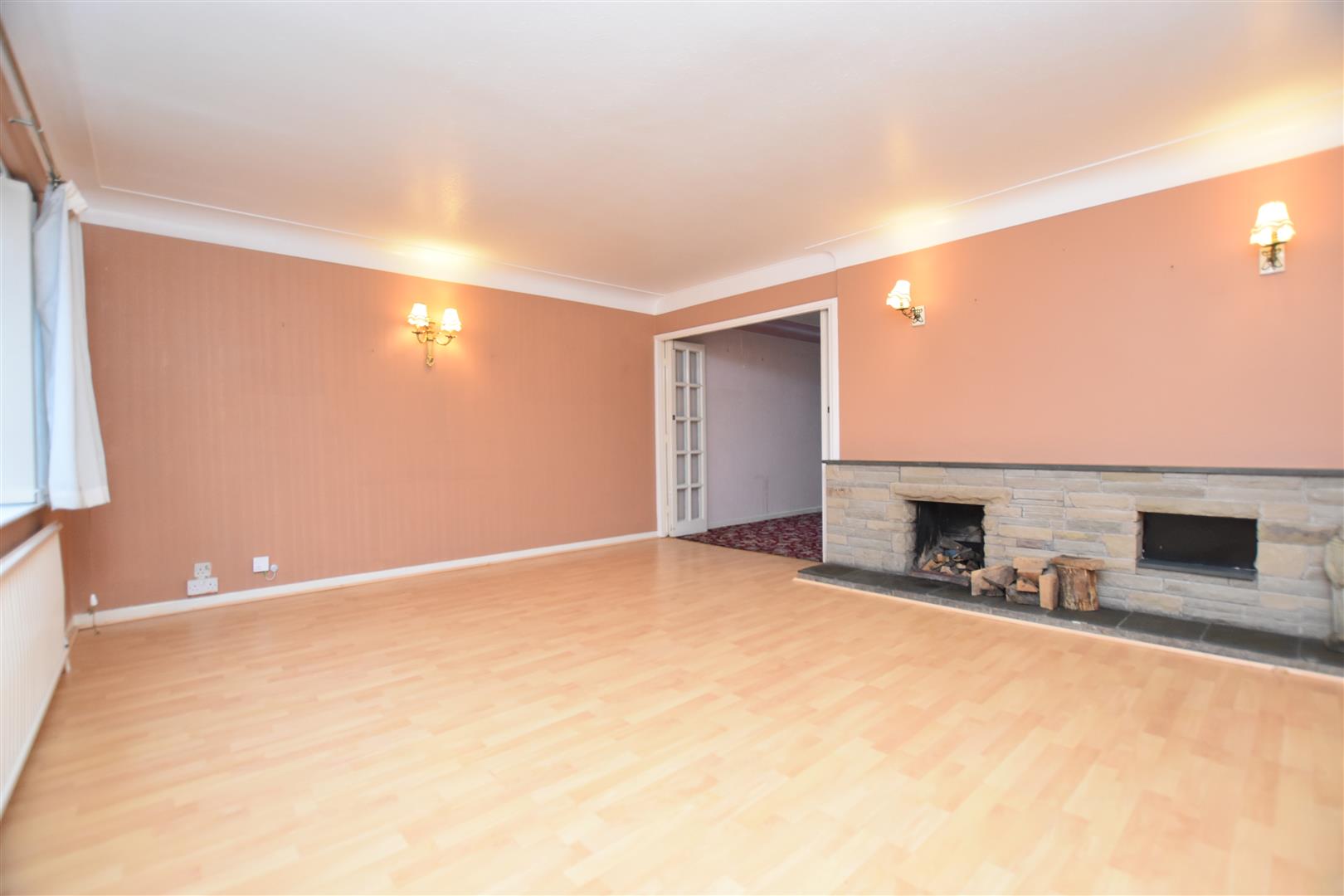 Upvc double glazed window to front, open fire set within fireplace, deep coving to ceiling, wall light points and double bi-fold doors opening to: