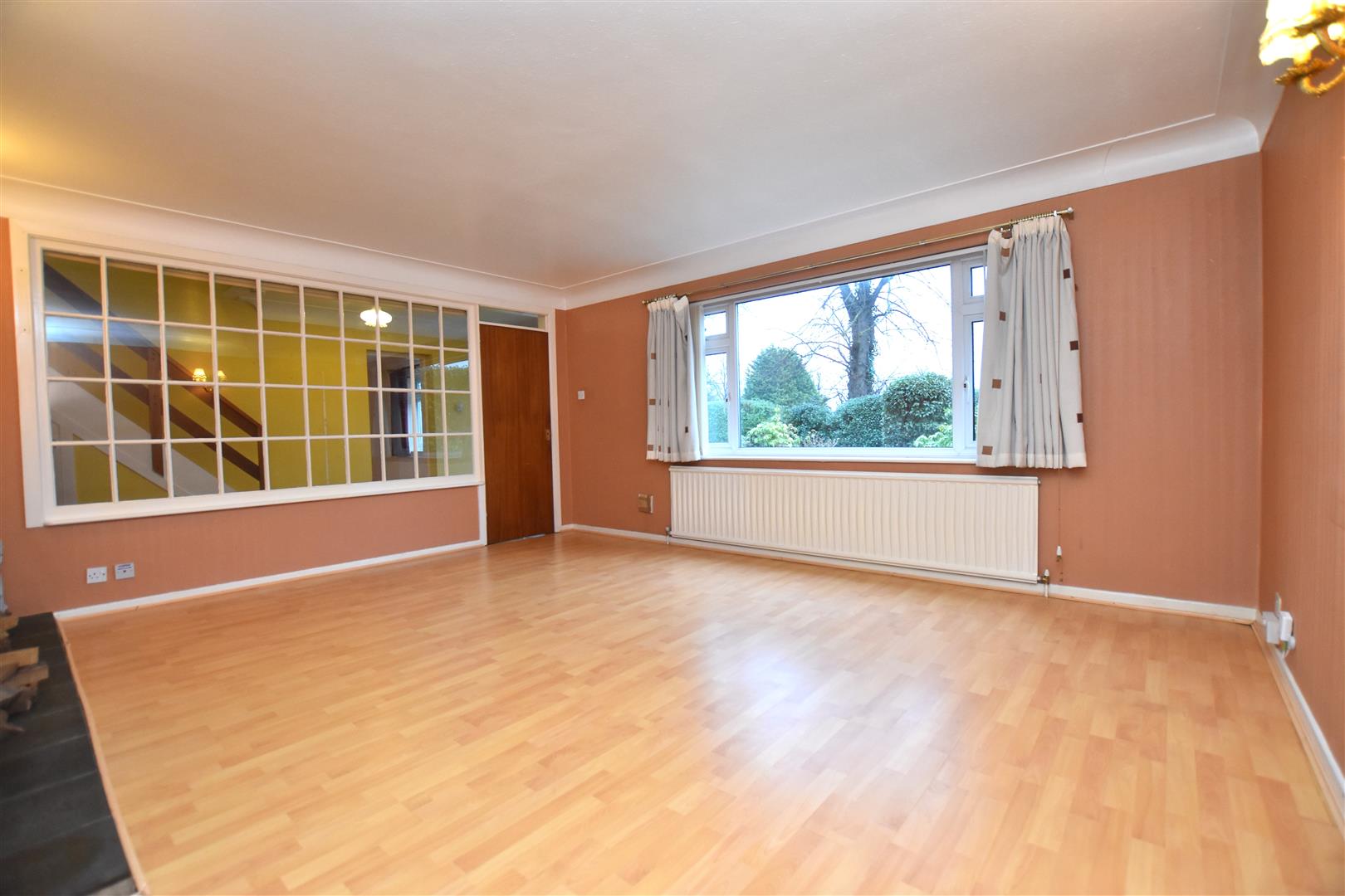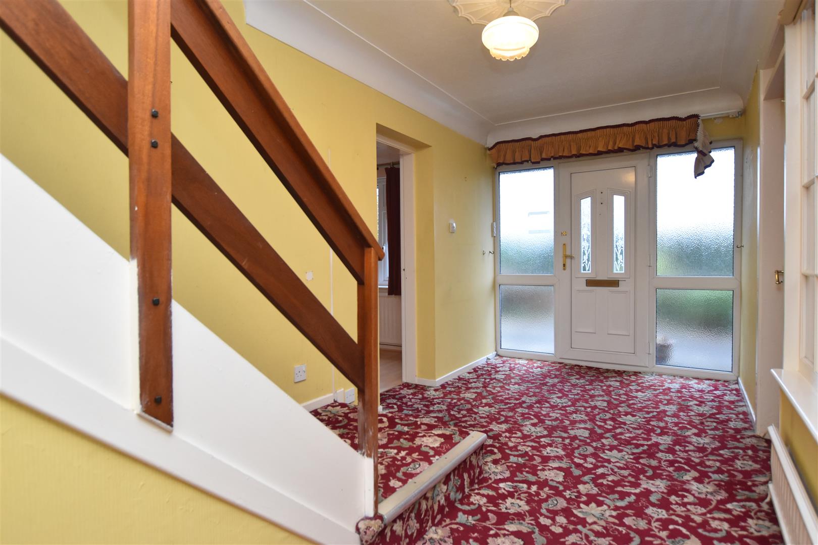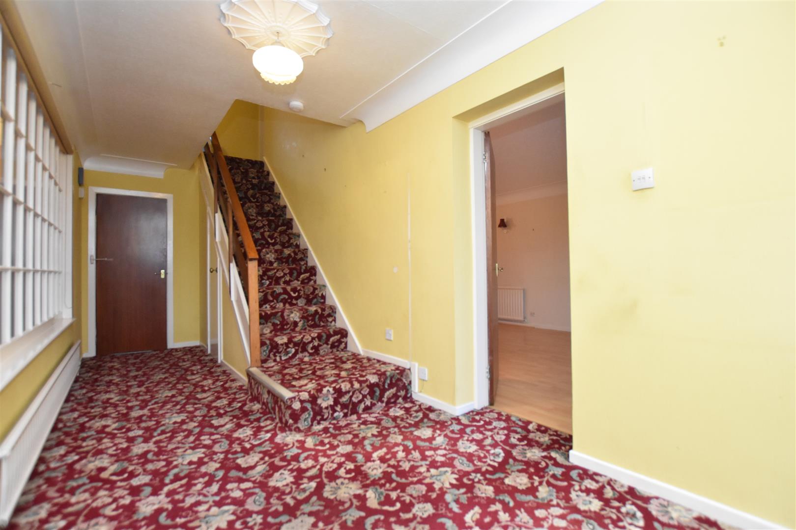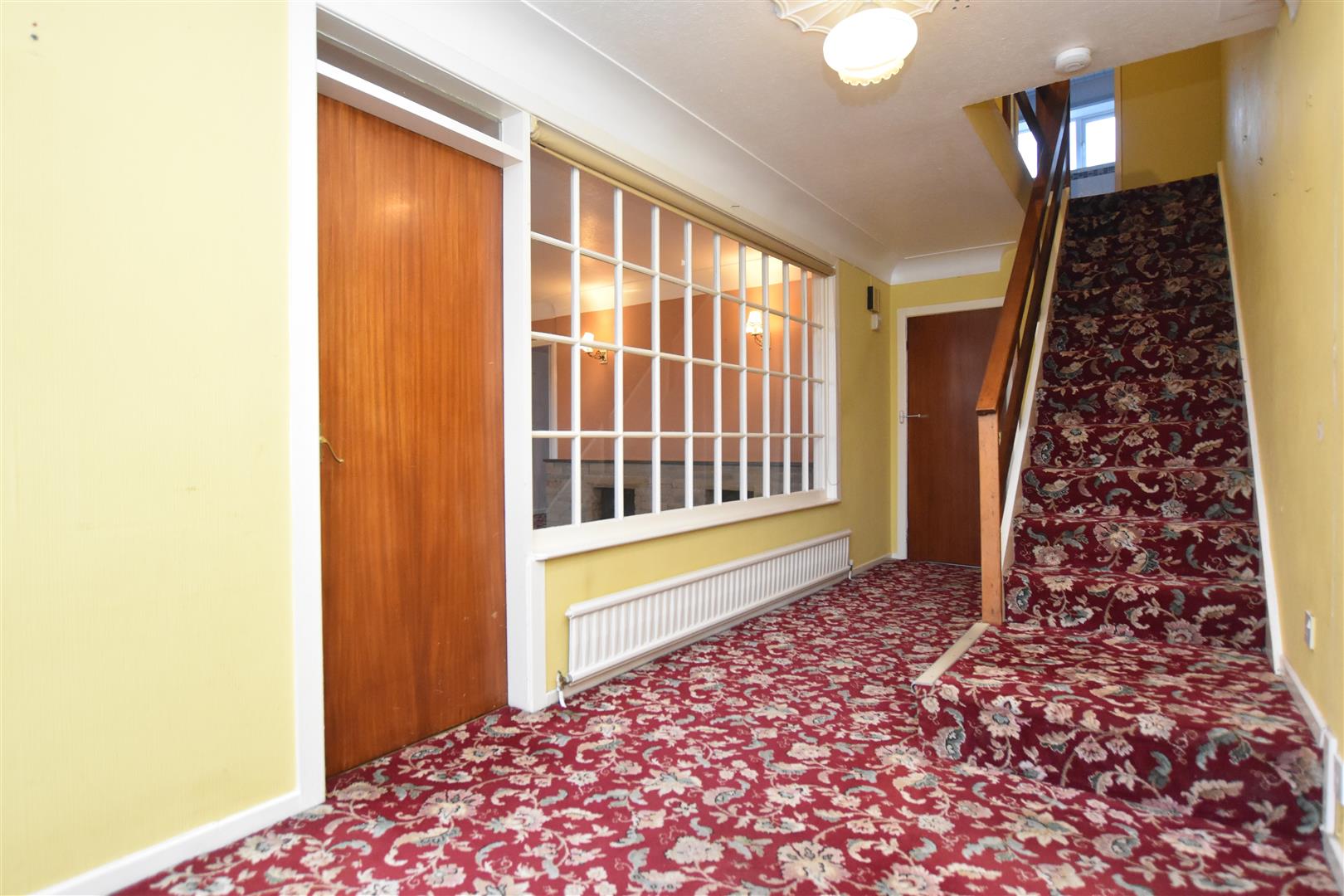 Having stairs to first floor landing with storage cupboard below, large feature internal window, radiator and deep coving to ceiling.