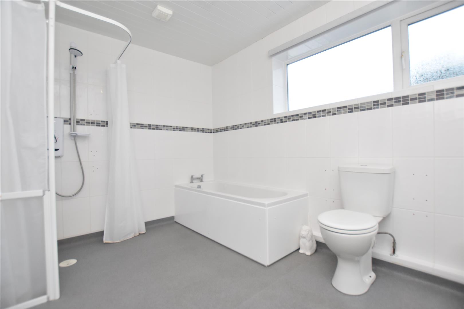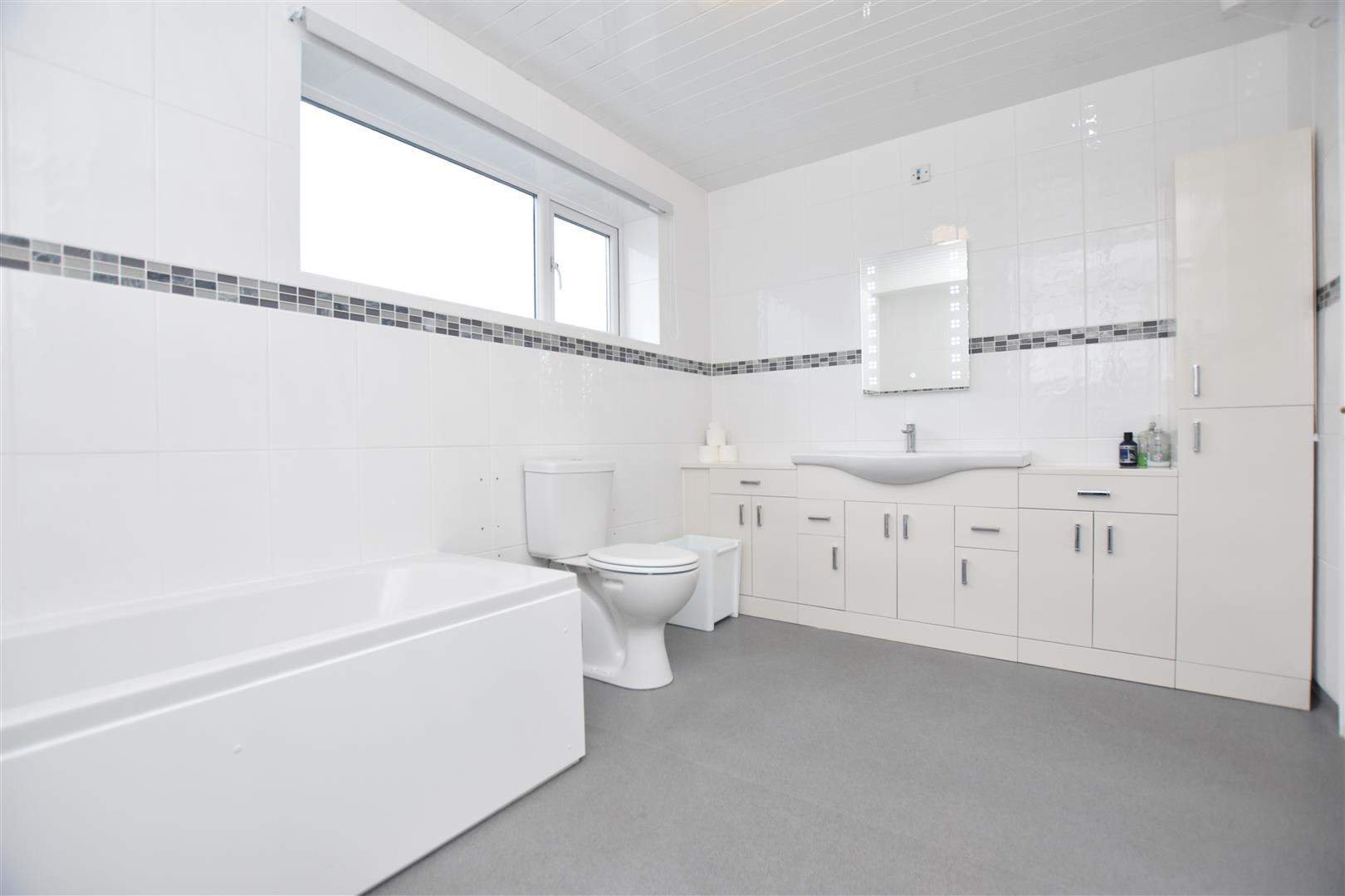 Appointed with a modern white suite of bath with mixer tap, low flush w.c, double ended wash basin with mixer tap set within full width vanity cupboards, illuminated mirror, corner shower area with electric shower unit, chrome heated towel rail, fully tiled walls and upvc double glazed window.