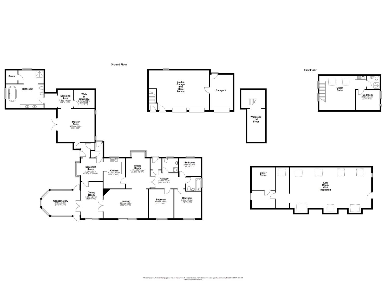 An external staircase (requires replacement) gives access to a large loft space above the main residence which is suitable for further development as additional bedroom and bathroom accommodation. Other possible uses include an office, games/snooker room and/or media rooms.