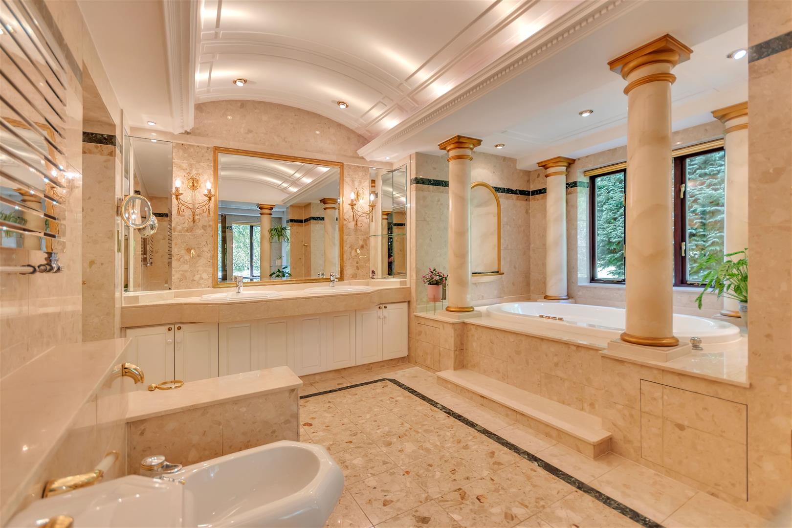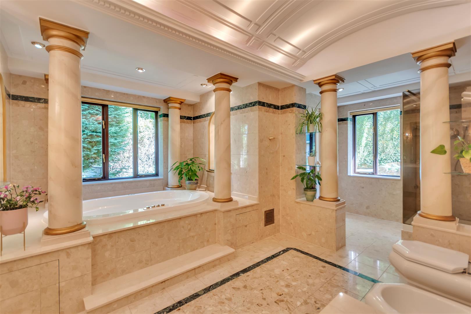 The exquisitely appointed Master Bathroom features Villeroy and Bosch suite, Jacuzzi double bath set in marble and columned surround. A marble vanity with twin wash hand basin, bidet, toilet under a panelled ceiling vault complete the space. Two columns open to a smoked glass shower enclosure and the Finlandia western red cedar Sauna.