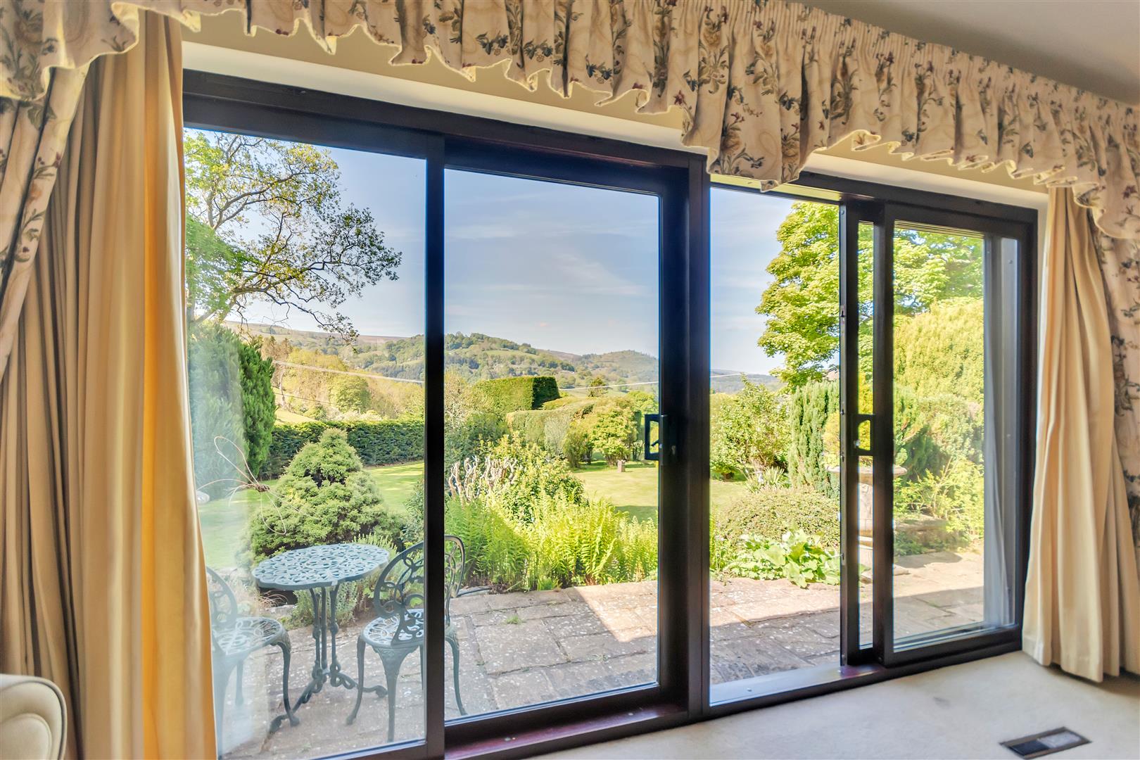 Spacious family room with sliding patio doors opening into the garden, offering south westerly views over the lawn and Dee Valley to Berwyn, Vivod and beyond.