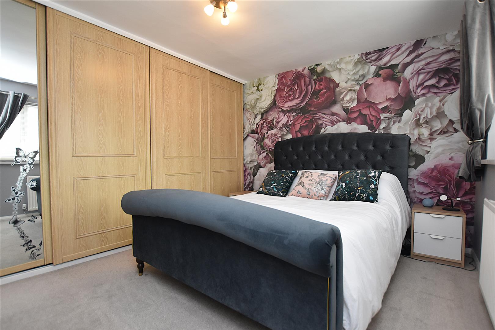 Sliding door fitted wardrobes, radiator and Upvc double glazed window to front.