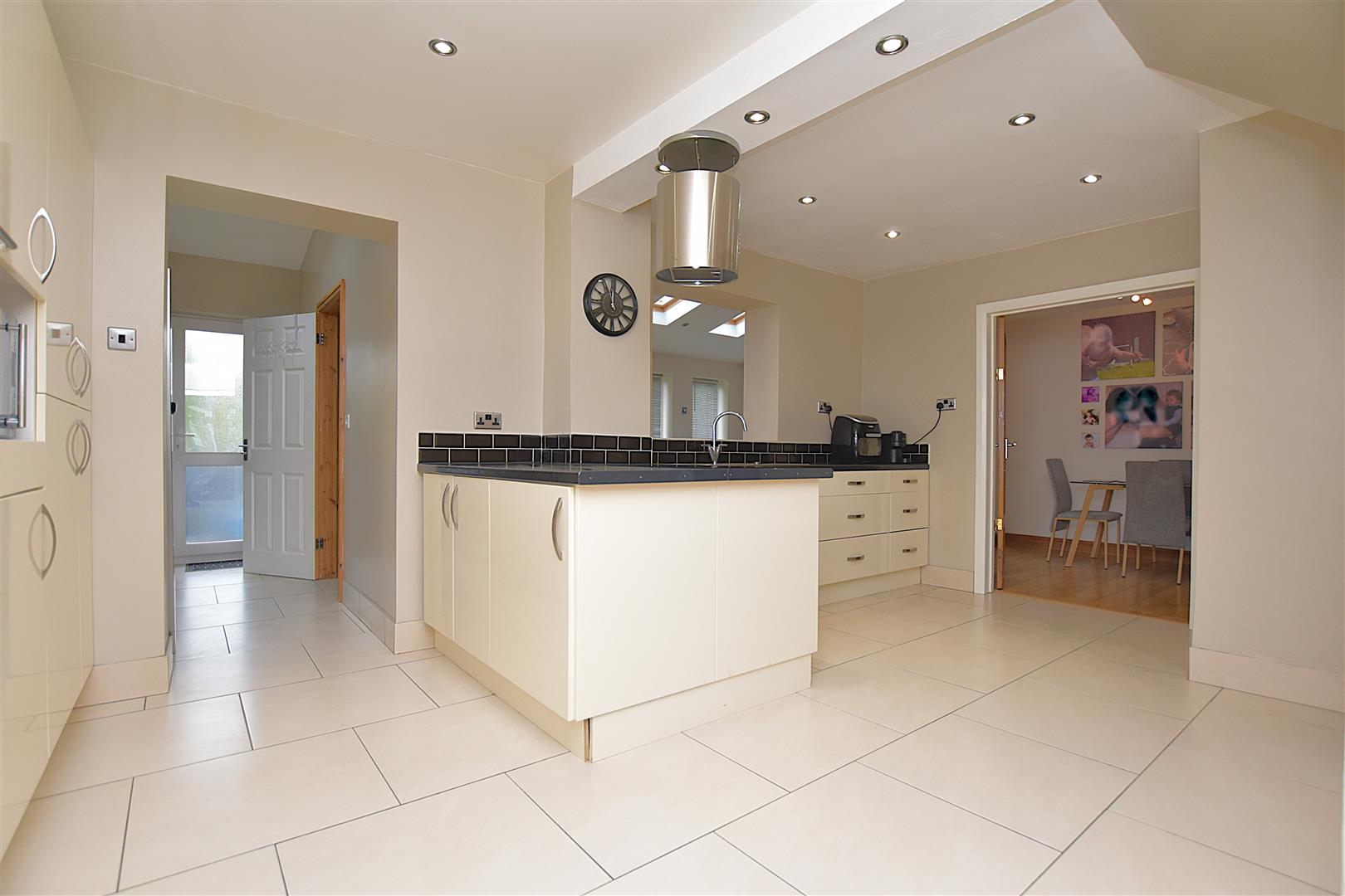 Fitted with gloss fronted base and wall cupboards, work surface area with plumbing for washing machine and space for dryer below, plumbing for dishwasher, heated tiled floor, space for American style fridge freezer, velux roof light window, part glazed Upvc external door, extractor fan and 6 panel door opening to the -