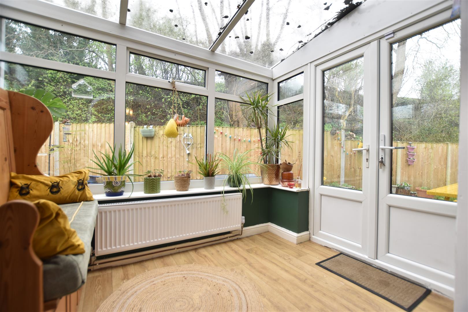 Accessed off the dining room with upvc double glazed windows on a brick plinth, upvc double glazed window to side, glass roof, wood effect vinyl flooring, radiator and wall light points.