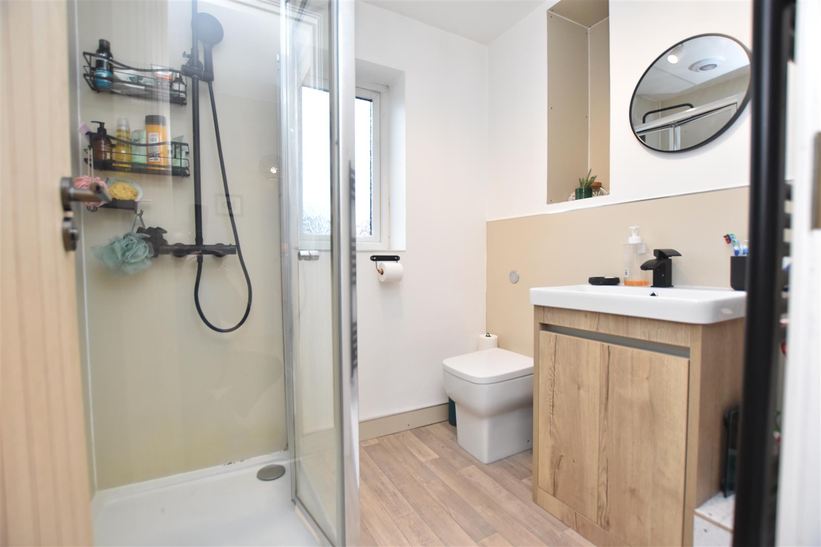 Appointed with a modern white suite of shower enclosure with mains thermostatic shower, wash basin with black mixer tap and vanity cupboard below, close coupled w.c with concealed cistern, upvc double glazed window, wipe clean wall panels, black heated towel rail, extractor fan and shaver socket within recess.