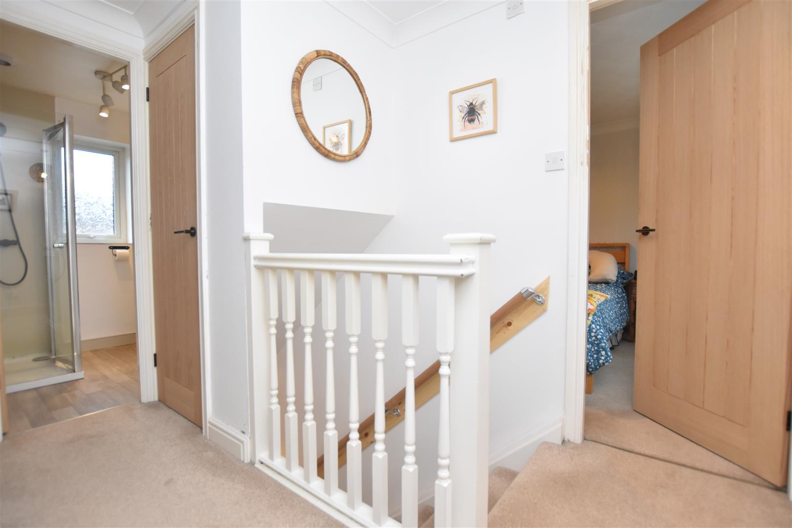 With handrail, ceiling hatch to roof space, upvc double glazed window, oak veneer internal doors and storage cupboard housing the Baxi gas combination boiler and shelving.