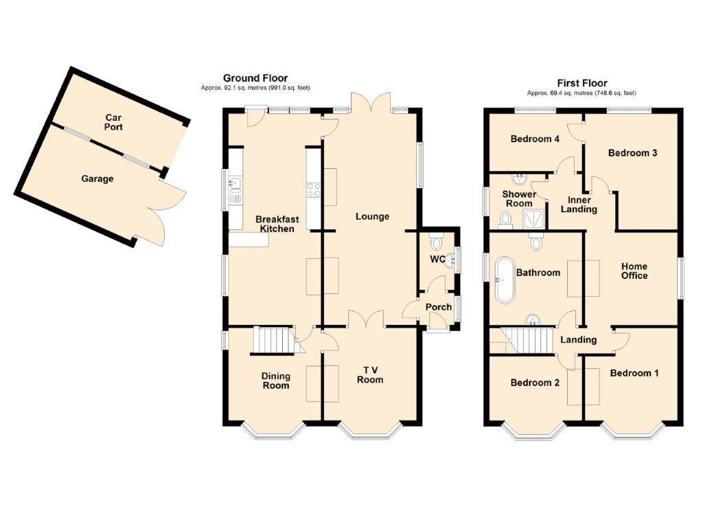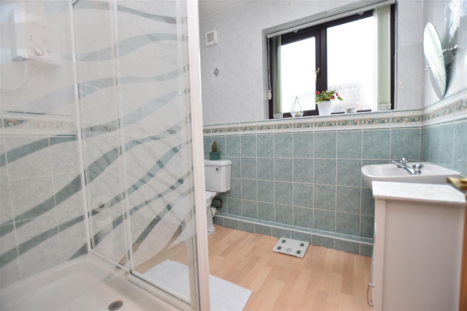 Appointed with a low flush w.c, pedestal wash basin, oversized shower enclosure with electric shower unit, inset ceiling spotlights, upvc double glazed window, fully tiled walls, extractor fan and chrome heated towel rail.