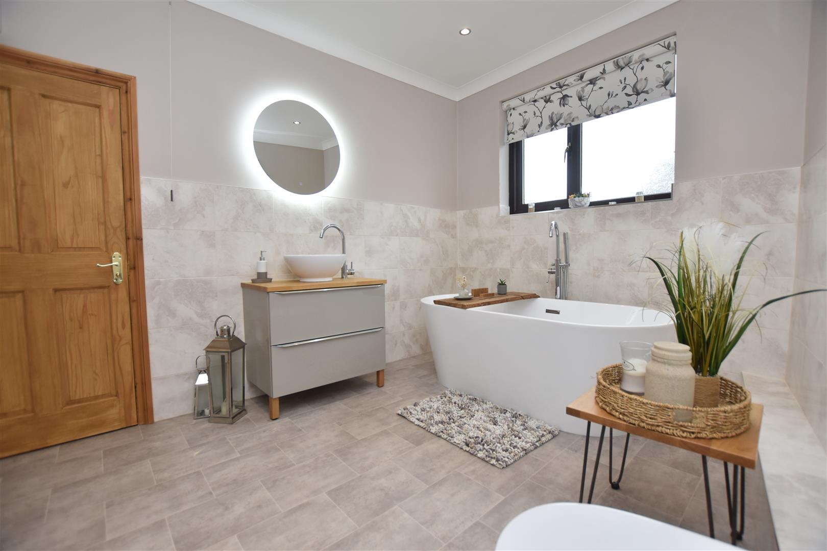 Beautifully appointed to an excellent standard including a wash bowl with mixer tap on vanity unit, double ended bath with free standing central mixer tap and hand held shower take-off, close coupled w.c, upvc double glazed window, part tiled walls, coving to ceiling, chrome heated towel rail and inset spotlights.