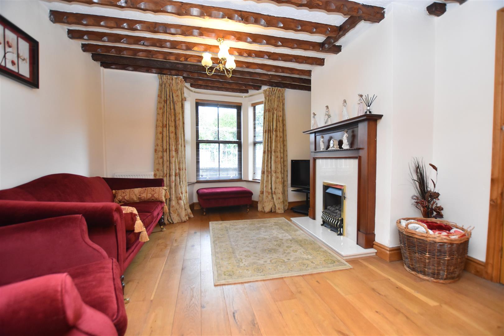 Living flame gas fire set within surround, exposed beams to ceiling, upvc double glazed bay window to front and radiator.