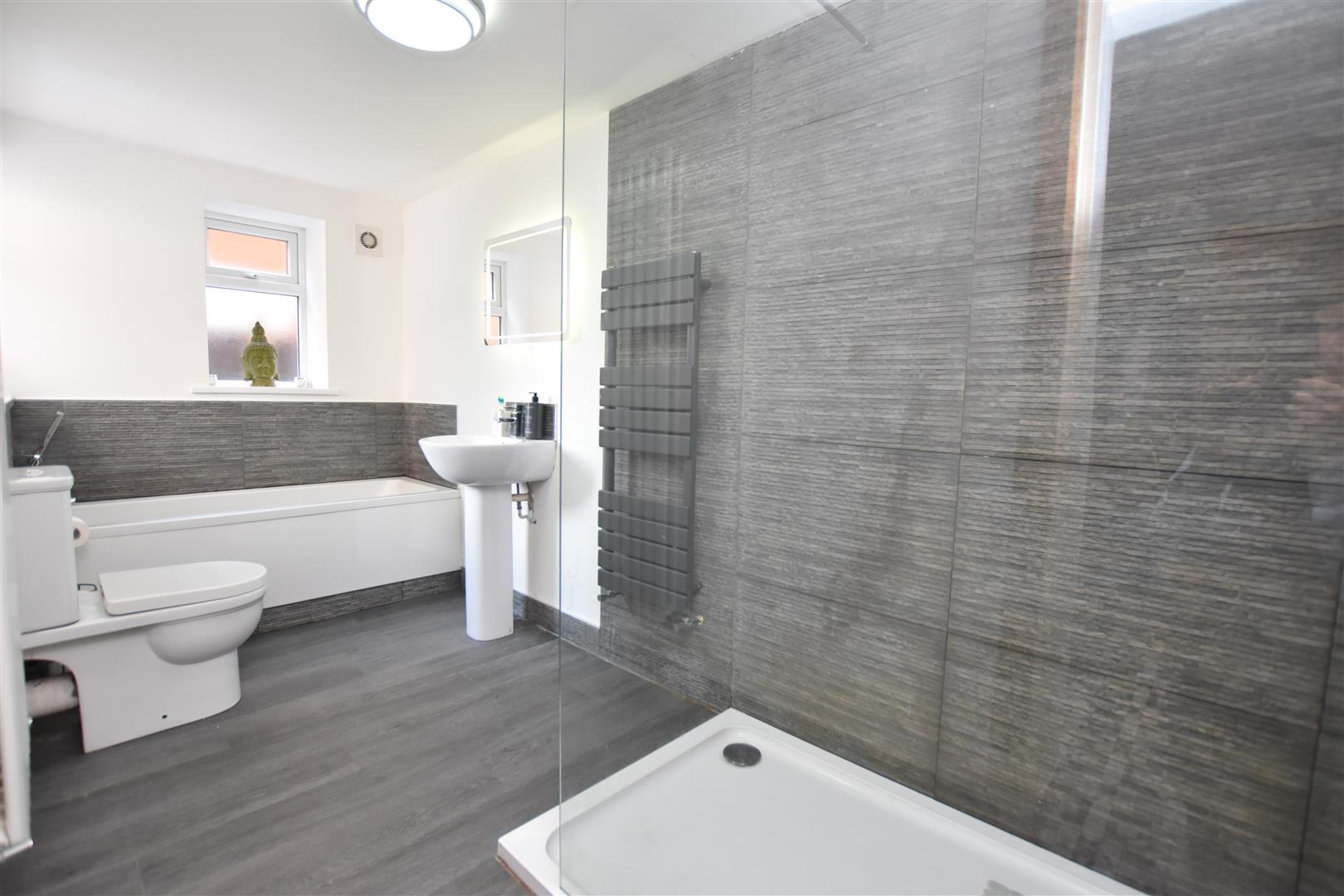Appointed to an excellent standard to include underfloor heating and comprising a white four piece suite of pedestal wash basin with mixer tap, bath with mixer tap and hand held shower take-off, close coupled w.c, large walk-in shower with mains thermostatic shower and Drench style shower head, grey part tiled walls, illuminated mirror, two upvc double glazed windows, extractor fan, two vertical radiators and grey wood effect flooring.