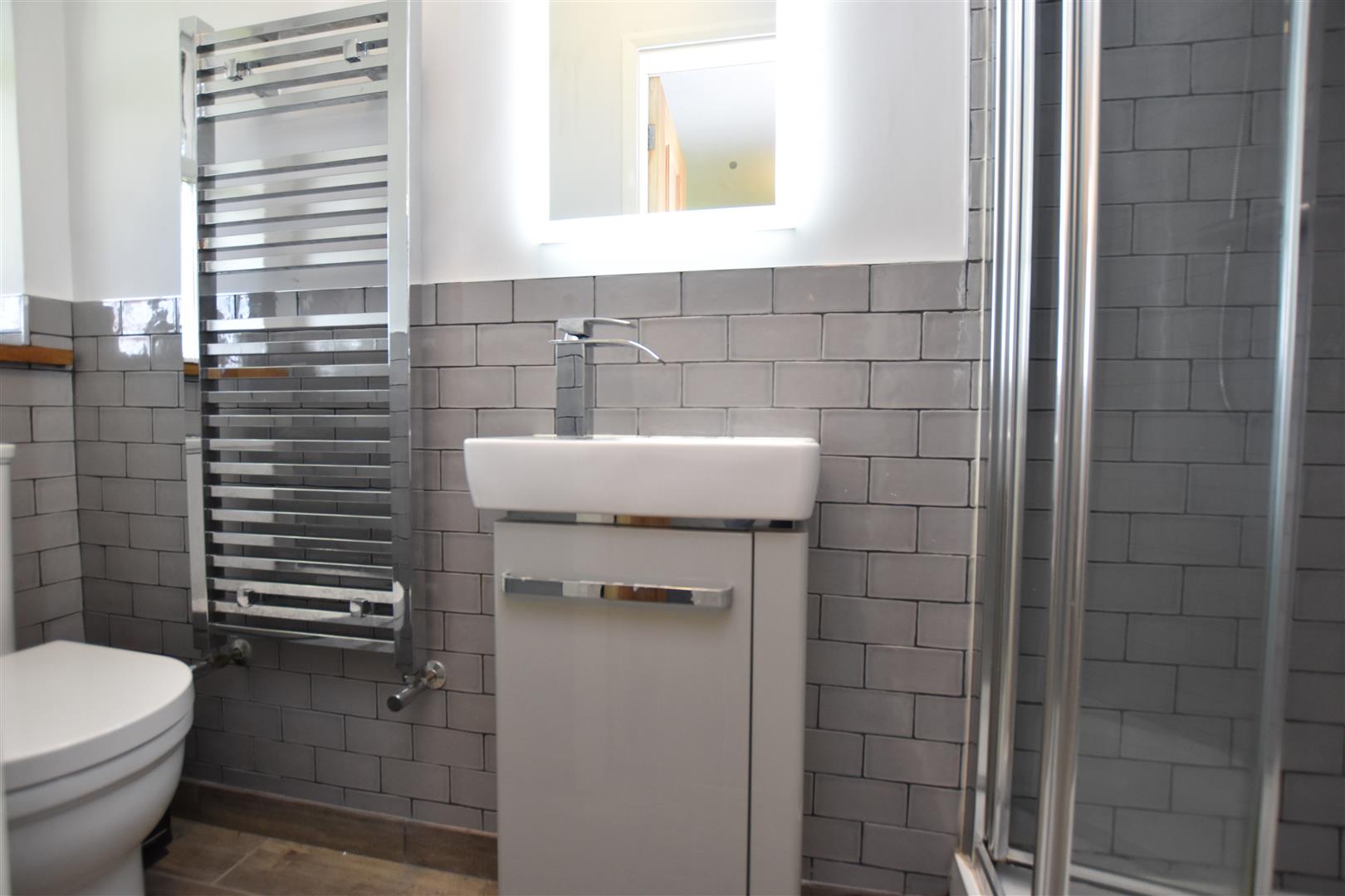 Appointed with a close coupled w.c, wash basin with chrome mixer tap, gloss vanity cupboard below and illuminated mirror above, shower enclosure with mains thermostatic shower and Drench style shower head, part tiled walls, upvc double glazed window, extractor fan and chrome heated towel rail.