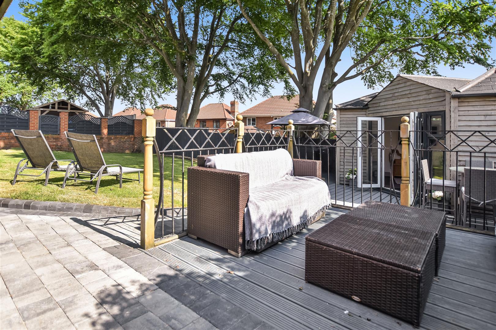 An excellent indoor entertaining space with upvc double glazed French doors, inset ceiling spotlights, work surface with cupboards below, grey wood effect flooring and raised television socket. In addition the enclosed garden includes a useful side storage area with decorative gravel and undercroft storage space.
