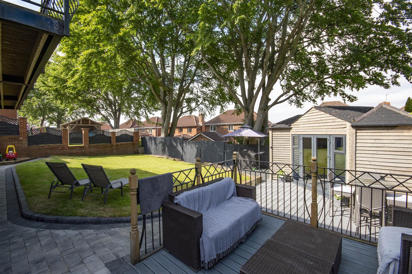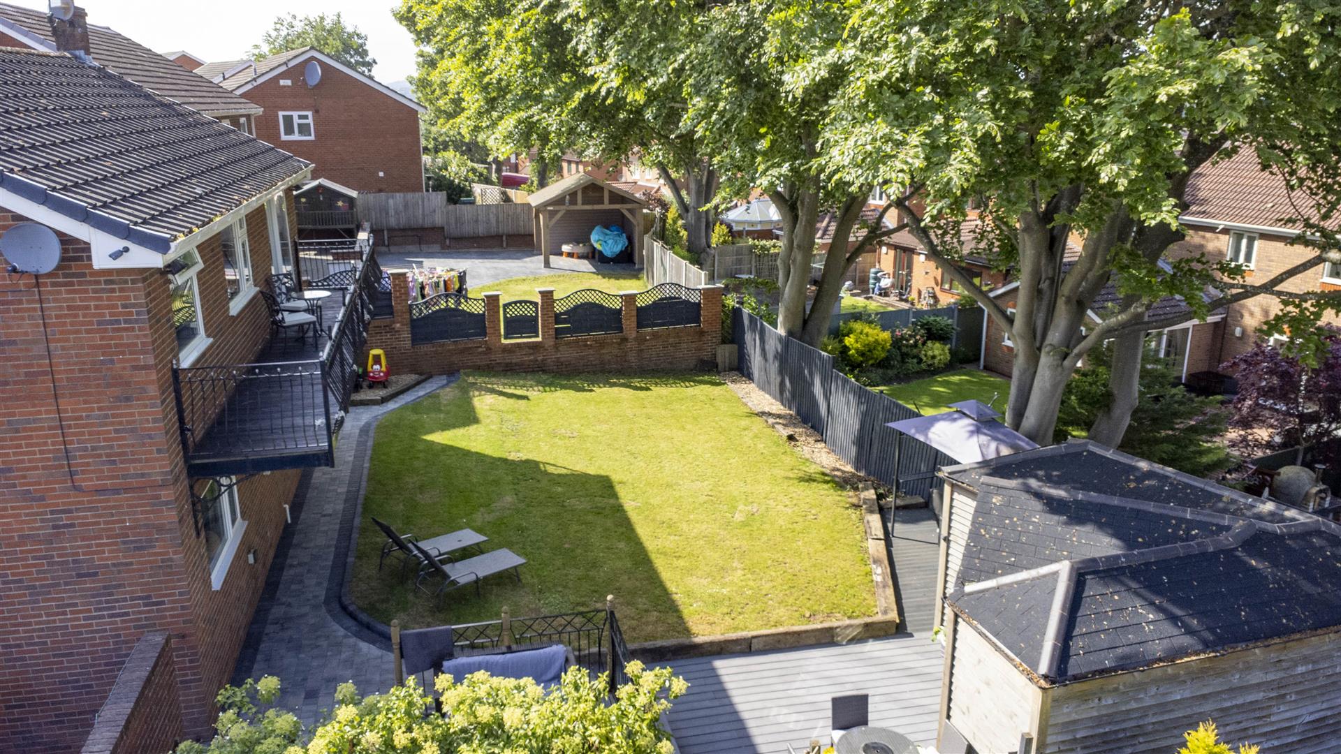 The property is approached along a double width private driveway which leads to the double garage having grey electric garage door, lighting and power socket. A front lawned garden with low level brick privacy wall and gated block paved path leads to a private courtyard area with pizza oven and decorative slate border. Gated grey block paved path leads alongside the house to the rear garden which is a particular feature of the property enjoying an excellent degree of privacy to include a shaped lawned garden bordered by block paved pathways, timber decked patio with decorative balustrade and an additional composite decked patio that leads to the: