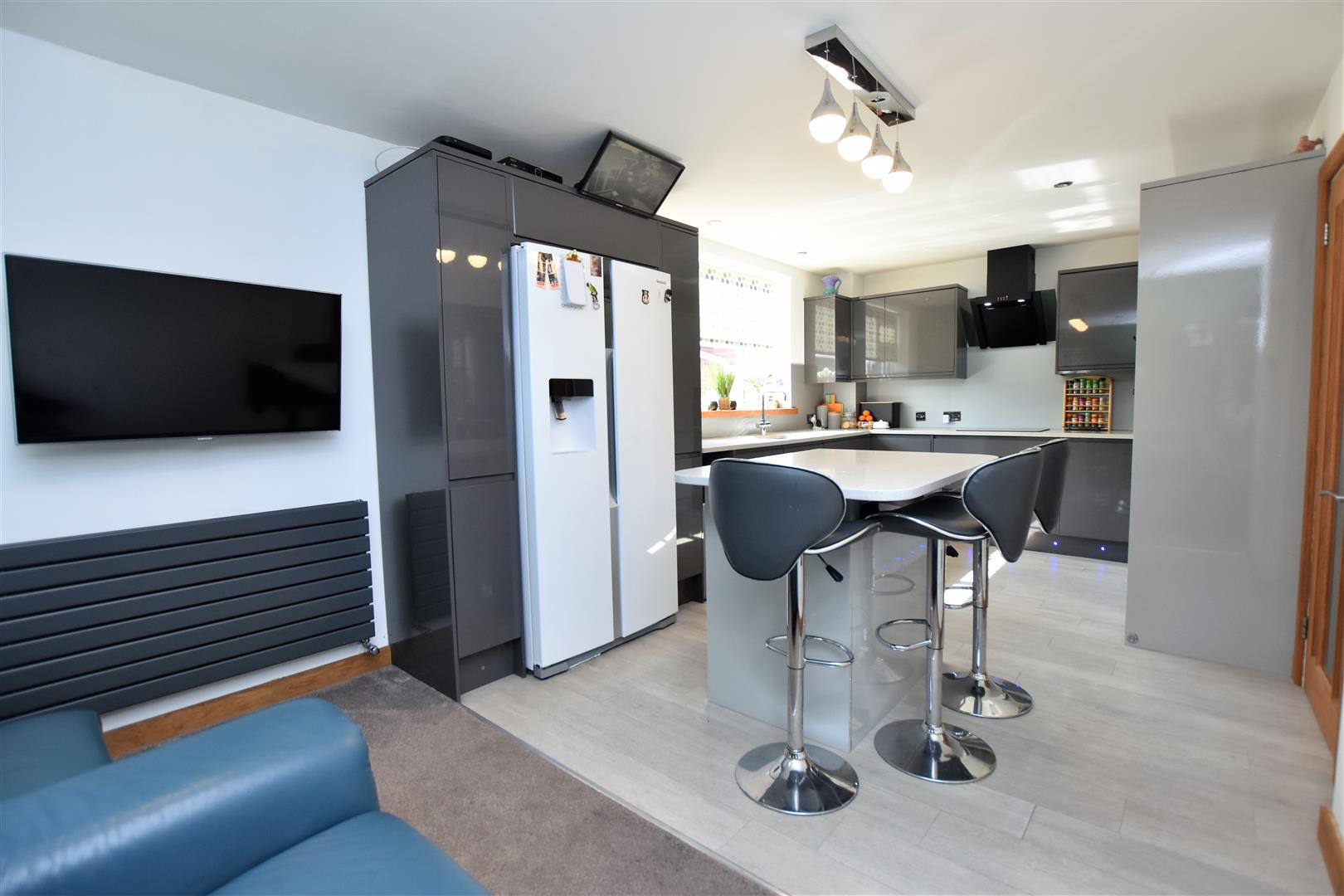 An impressive family room stylishly appointed with a range of gloss fronted base and wall cupboards complimented by granite work surface areas with inset 1 ½ bowl sink unit with mixer tap incorporating instant boiling water, ingrained drainer, Smeg double oven/grill, four ring Neff induction hob with angled extractor hood above, integrated dishwasher, housing for fridge freezer with water supply, low level plinth LED lighting, central island with matching granite worktop and breakfast bar, upvc double glazed window to side, underfloor heating, upvc double glazed window to rear, part wood effect flooring, raised electric socket for wall mounted television and grey modern radiator.