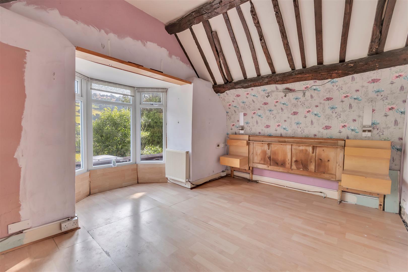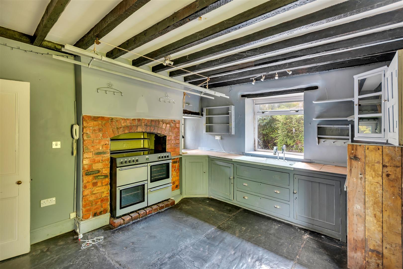 Fitted units with work surface areas, beams to ceiling, slate floor, exposed brick chimney breast, two windows.